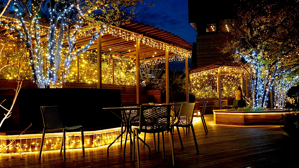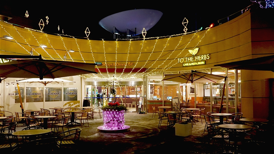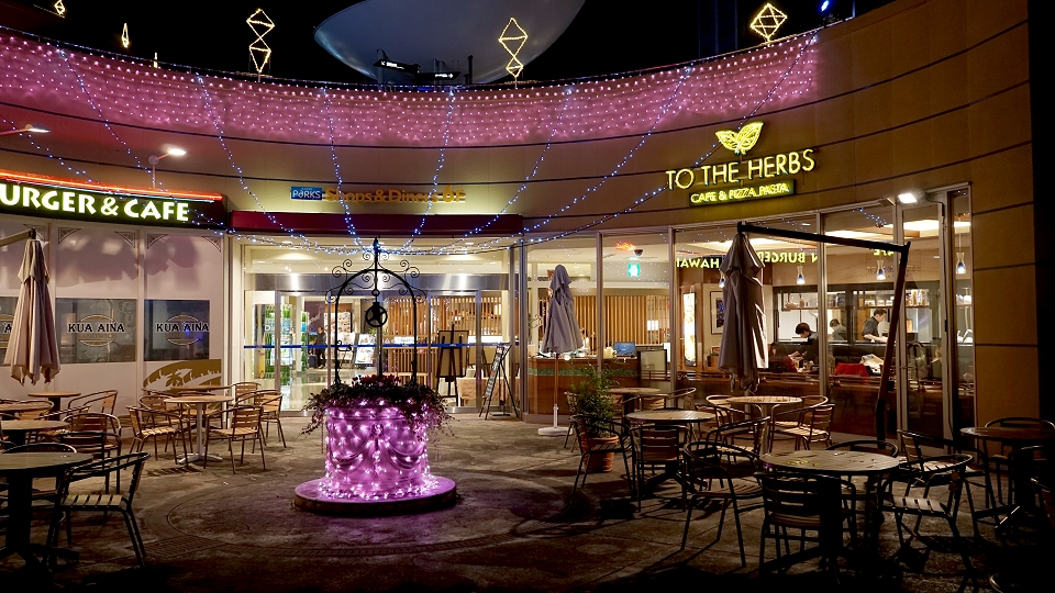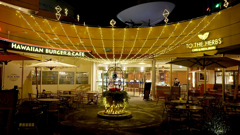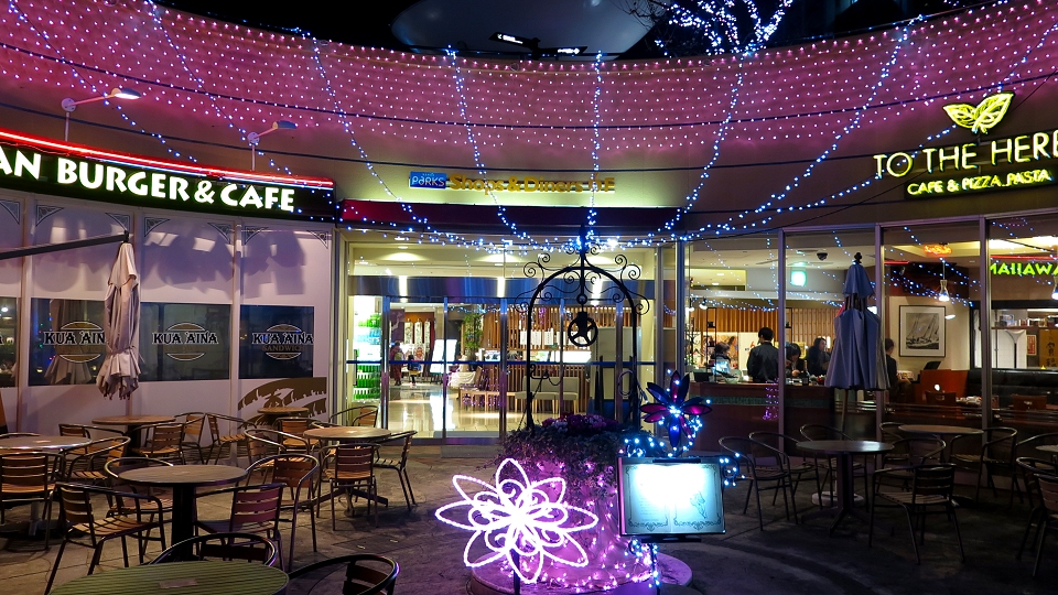 ここ二階のキャニオンストリートからなんばパークスです・・・ キノコのようなオブジェの色の変化が素敵です。