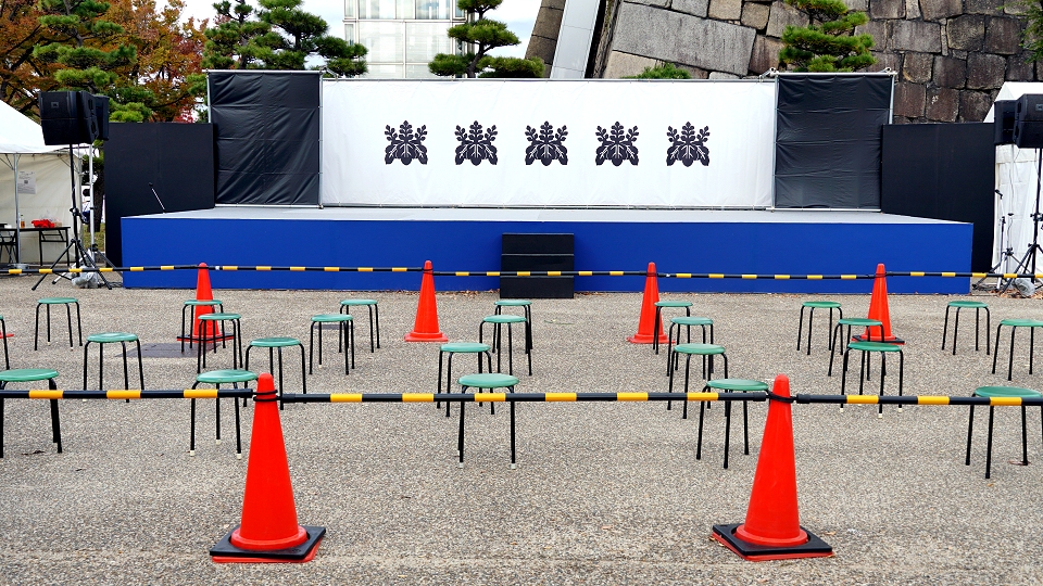 こちらはメインステージ ソーシャルディスタンスを守った椅子が並べられてます。 今はちょうど一部と二部の切り替えタイムなので誰もはいれません。