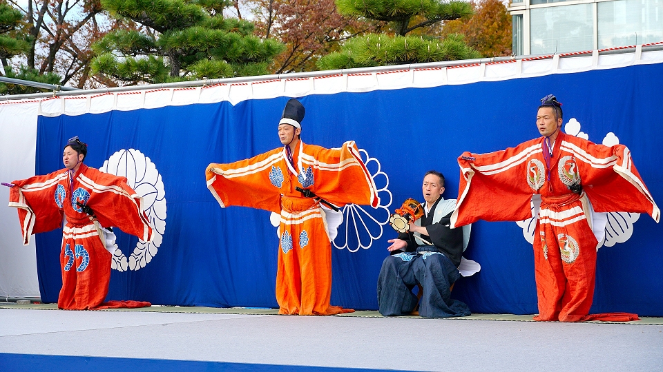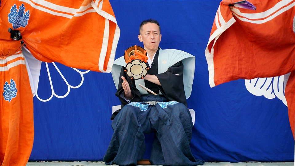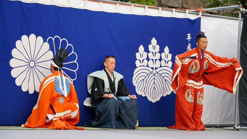 14:00、開演となりました 幸若舞保存会による「国指定重要無形民俗文化財 幸若舞 敦盛」です 「幸若舞(こうわかまい)は、室町時代に流行した語りを伴う曲舞の一種。 福岡県みやま市瀬高町大江に伝わる重要無形民俗文化財(1976年指定)の 民俗芸能として現存している。 能や歌舞伎の原型といわれ、七百年の伝統を持ち、 毎年1月20日に大江天満神社で奉納される」(Wikipediaより)