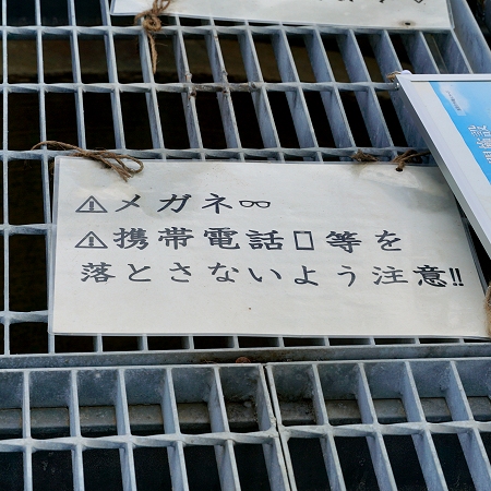 格子状の鉄板を覗くと、下の方には秀吉さんが築いたとみられる石垣の一部が・・・ で、スタッフに意地悪な質問をしてみました・・・ 「もしスマホを落としたらどうするんですか」って・・・ 予期していなかったようで、「ん~~~・・・、どうしましょう・・・」 とにかく簡単ではなさそうなので、中を撮影したい方はくれぐれも注意してください・・・