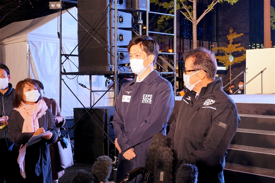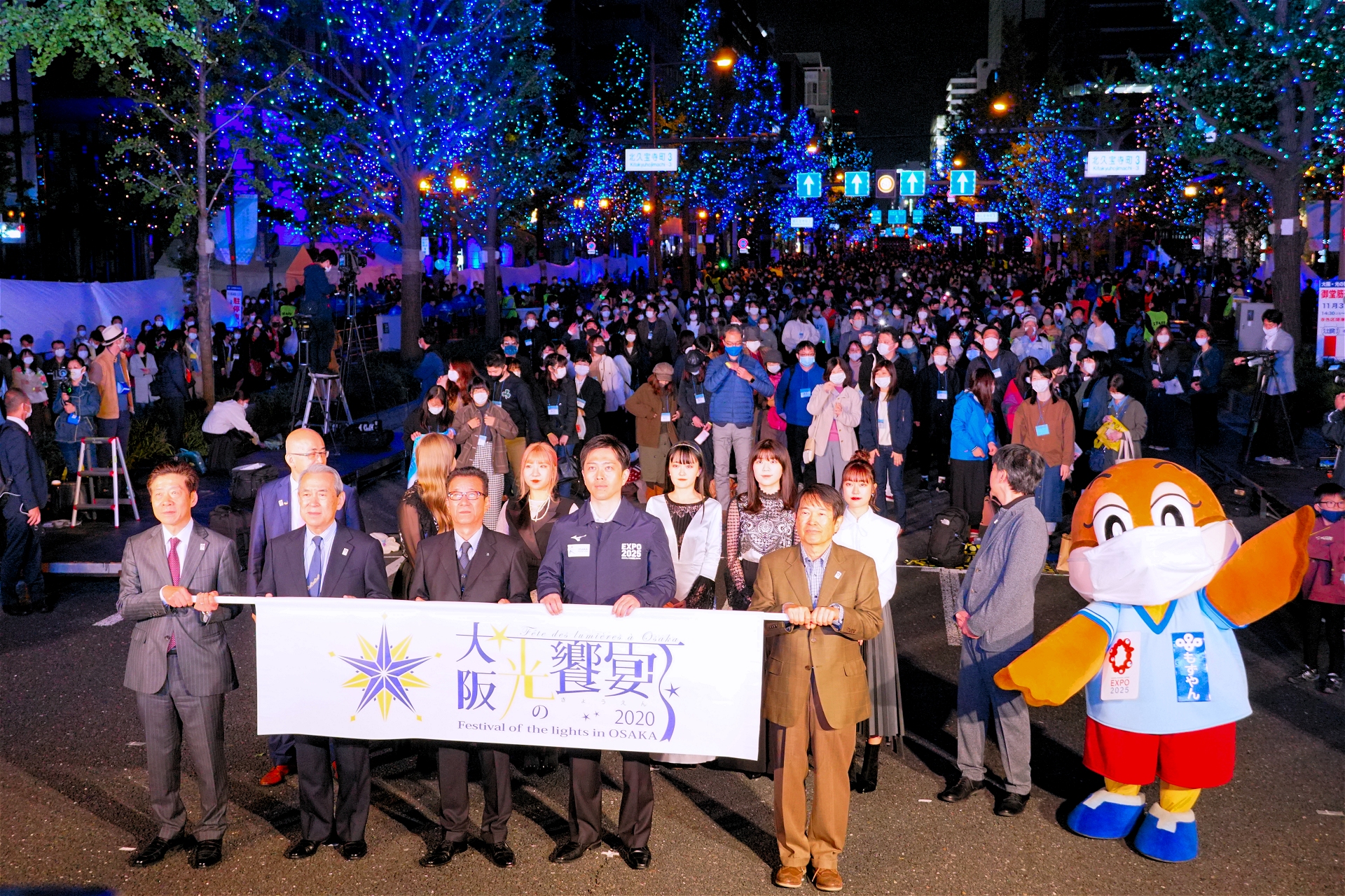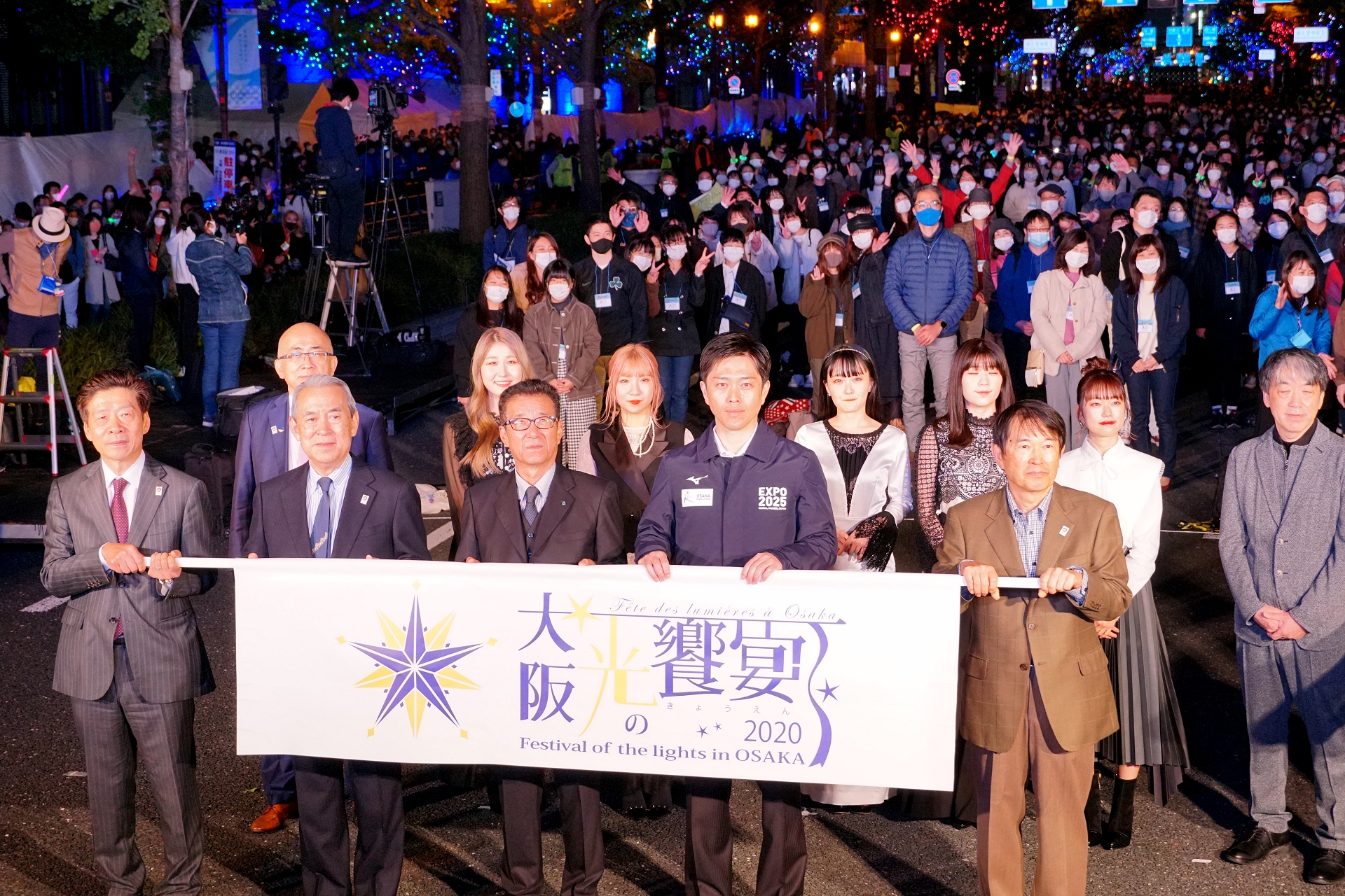 まもなく点灯式 その前に吉村知事・・・ 「やめようかという話も出ていた。しかし、この時期どうなっているかわからないけれど、 コロナかだからこそ大阪は元気に上を向いて、元気づけられるよう開催を決めた。テーマは希望の光、ぜひ楽しんでいってほしい」 松井市長・・・ 「『大阪・光の饗宴』はギネスにも登録され、冬を盛り上げるビッグイベントになった。 これから先も拡大して、大勢の人を元気に勇気づけるイベントにしたい饗宴』はギネスにも登録され、 冬を盛り上げるビッグイベントになった。これから先も拡大して、大勢の人を元気に勇気づけるイベントにしたい」 と・・・