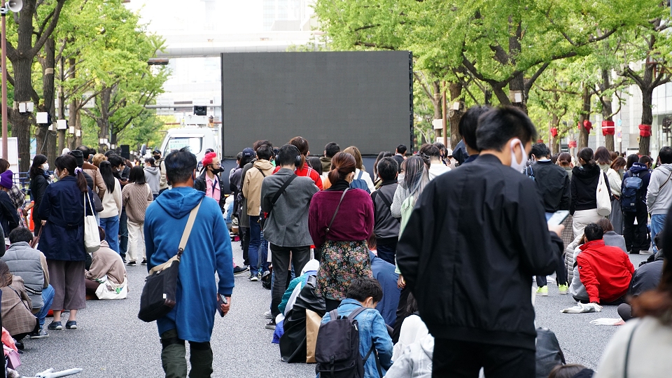 近くによってみると、大きなスクリーンが・・・ このあたりから、メインステージまで約300mあります。 というわけで、みんなに見えるようLEDビジョンカー登場となったわけです。