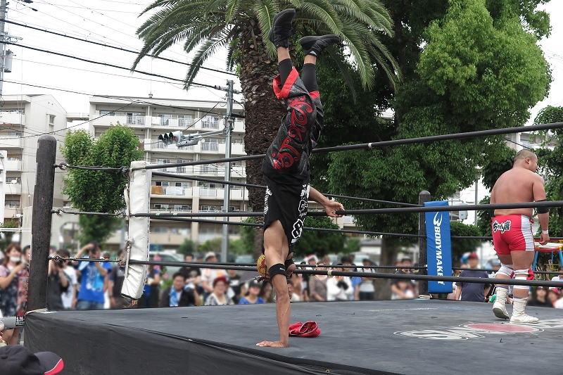 12:57、ゴングです。 最初は「神威」と「ダイナ御堂」のシングルマッチ