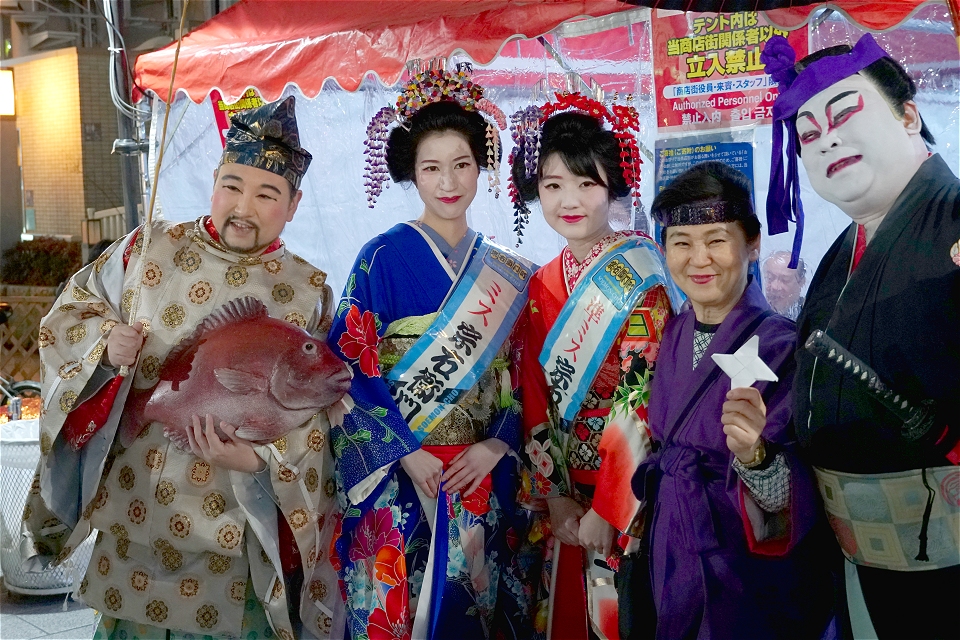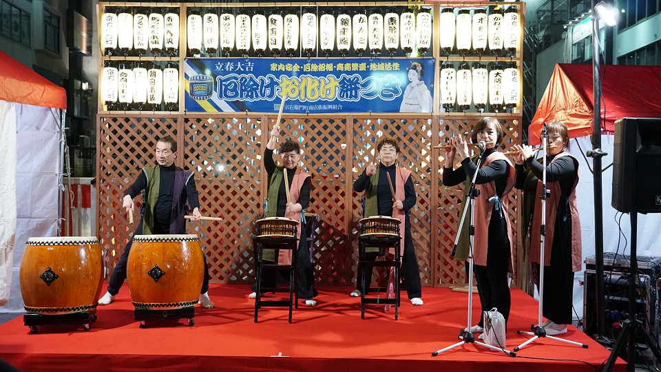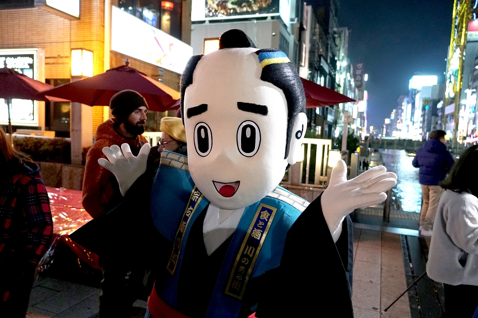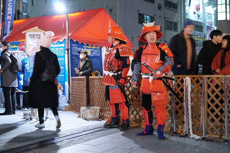 節分、今回は四か所を堪能することに・・・ お初天神から急いでかけつけた、道頓堀相合橋の上・・・ 正式には「あいあうばし」なのですが「あいあいばし」でも間違いじゃないです 午後6時25分、もうすでに始まってました・・・