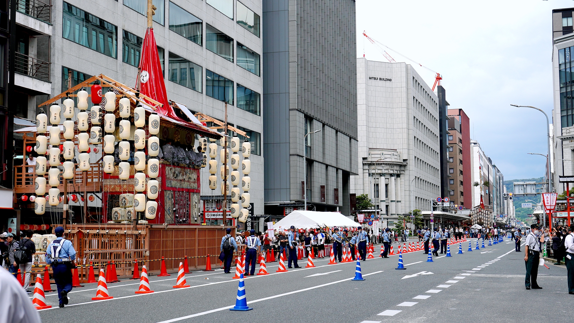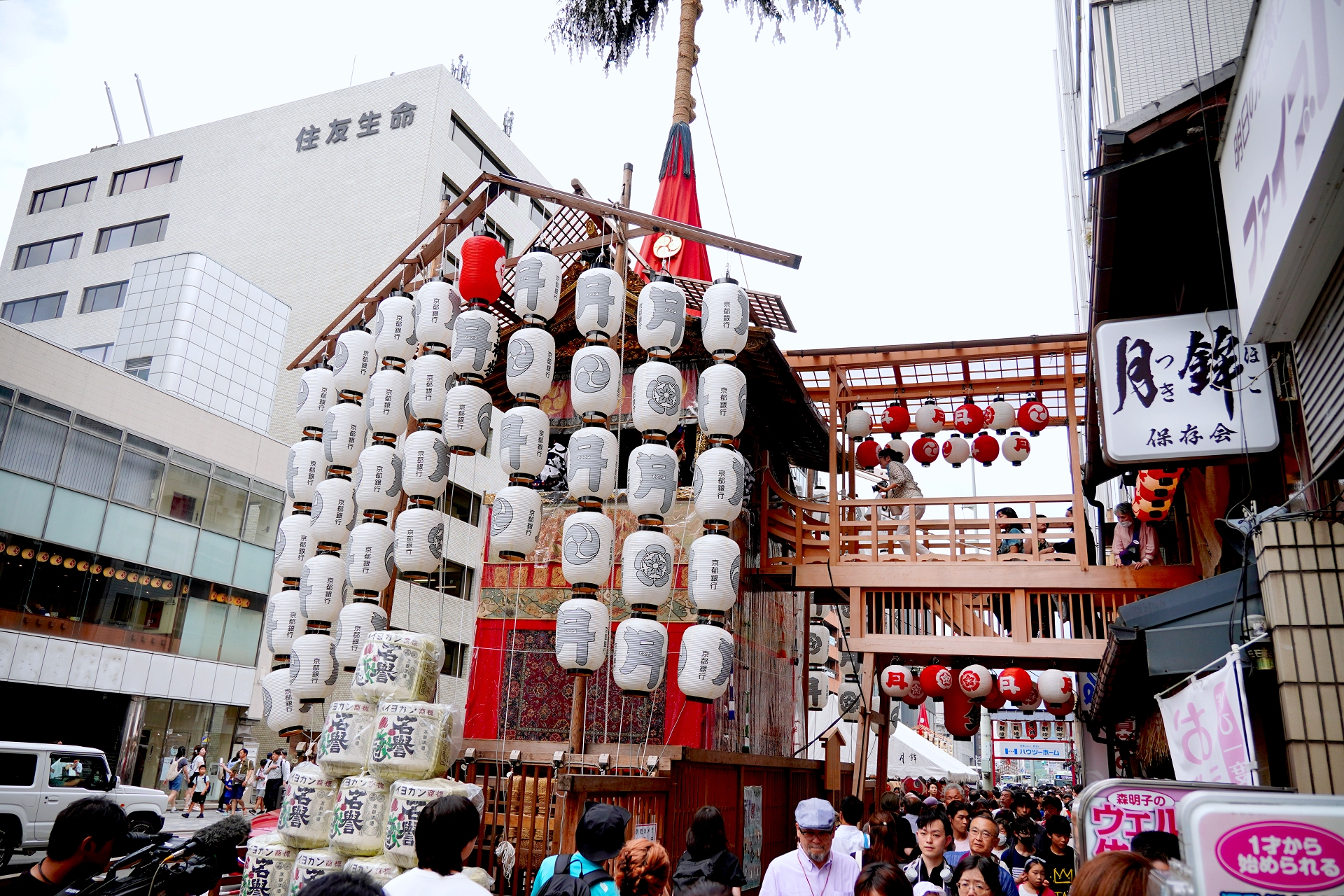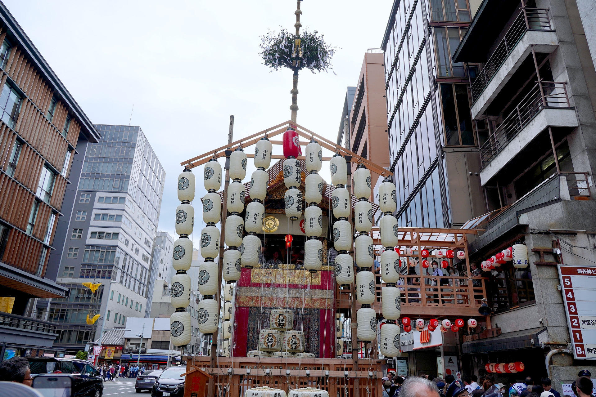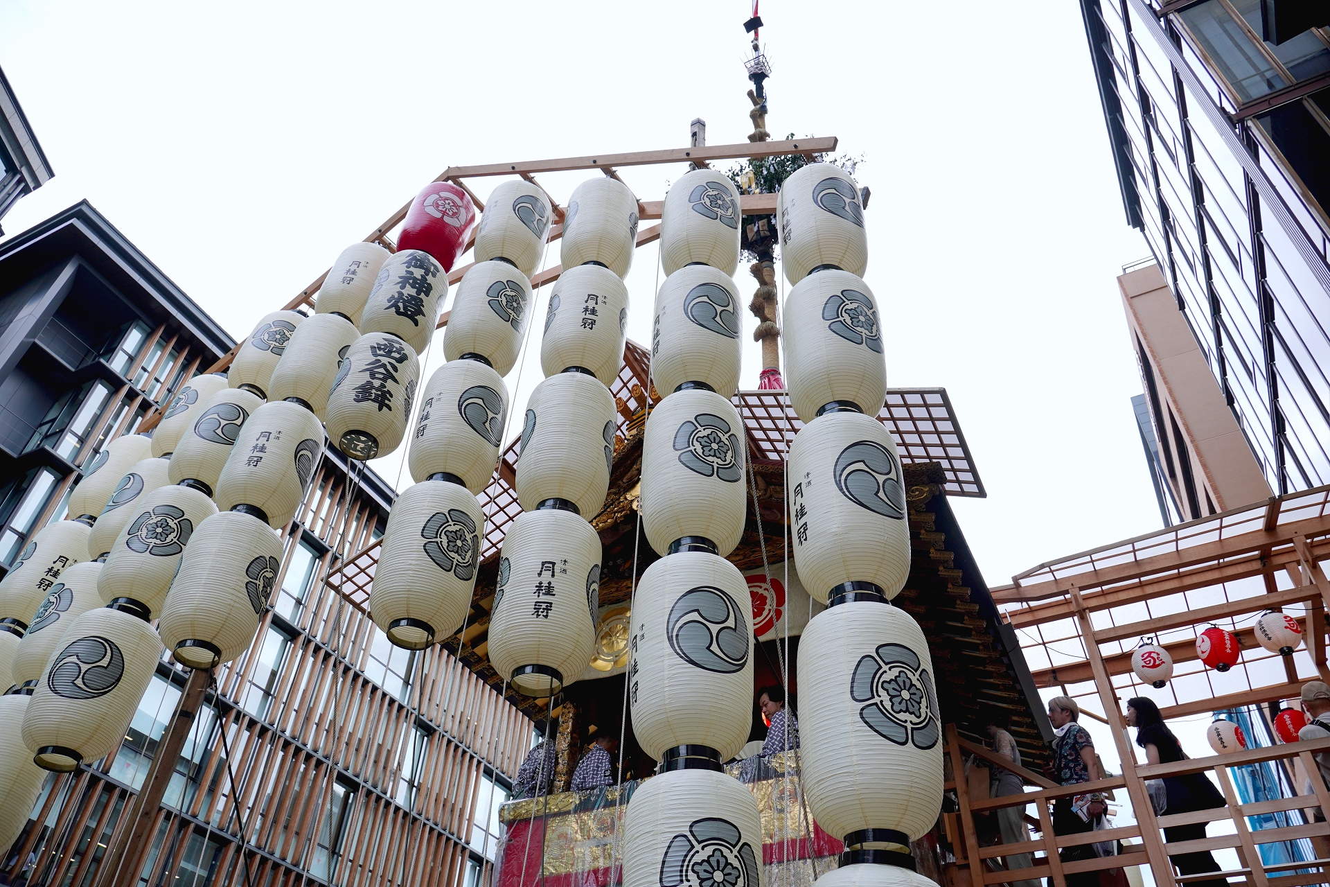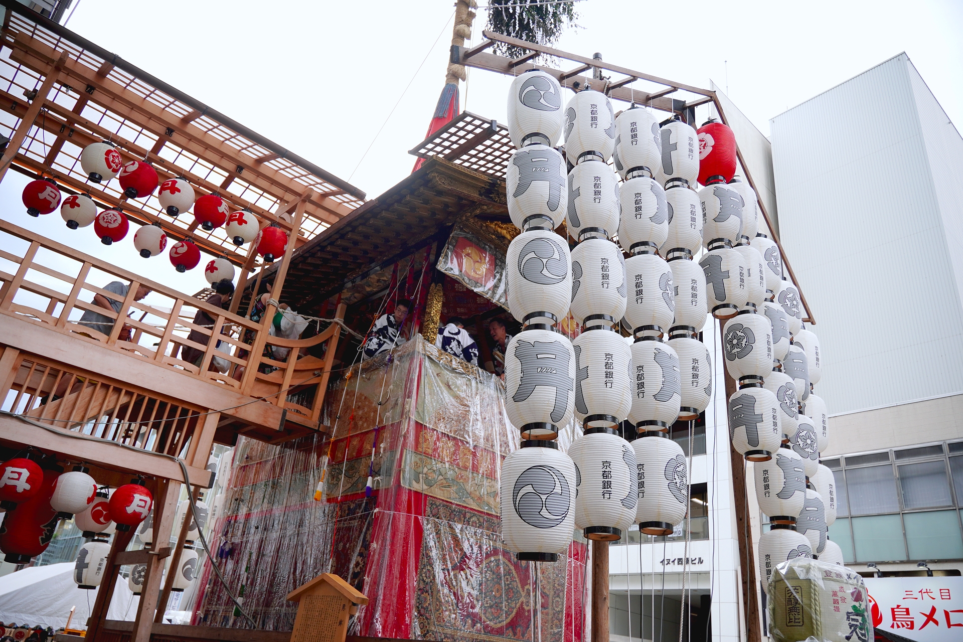 地下駅から地上へ上がると四条通、そしてそこにはひときわ大きい山鉾が… 函谷鉾です