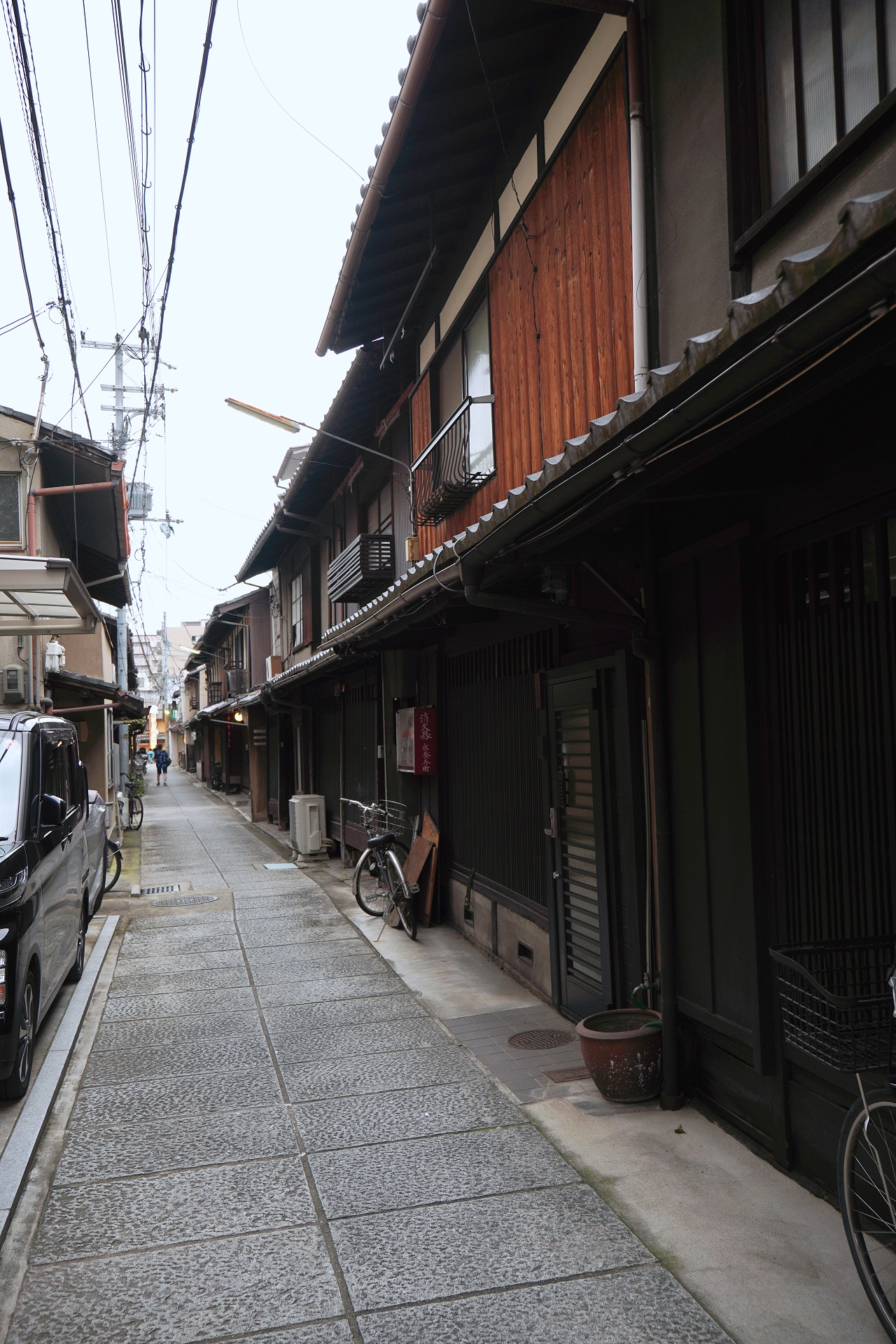 17:35、新町通、ここはたくさんの山鉾が通るので、電柱ガードが向こうの方まで