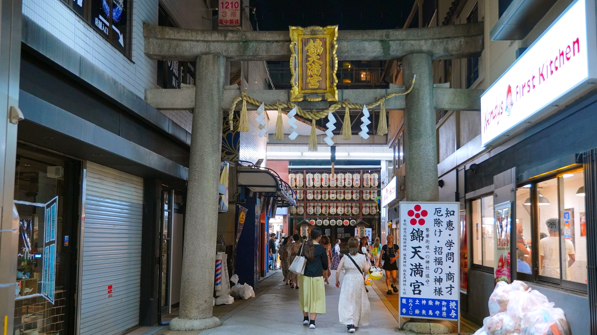 一本北側の錦小路通をてくてくと… ハハ、外国人ばっかりでした やっぱり40分以上電車に揺られるのだったら、一駅歩いてでも始発からじゃないとね… 錦市場を抜けたところに天満宮が…