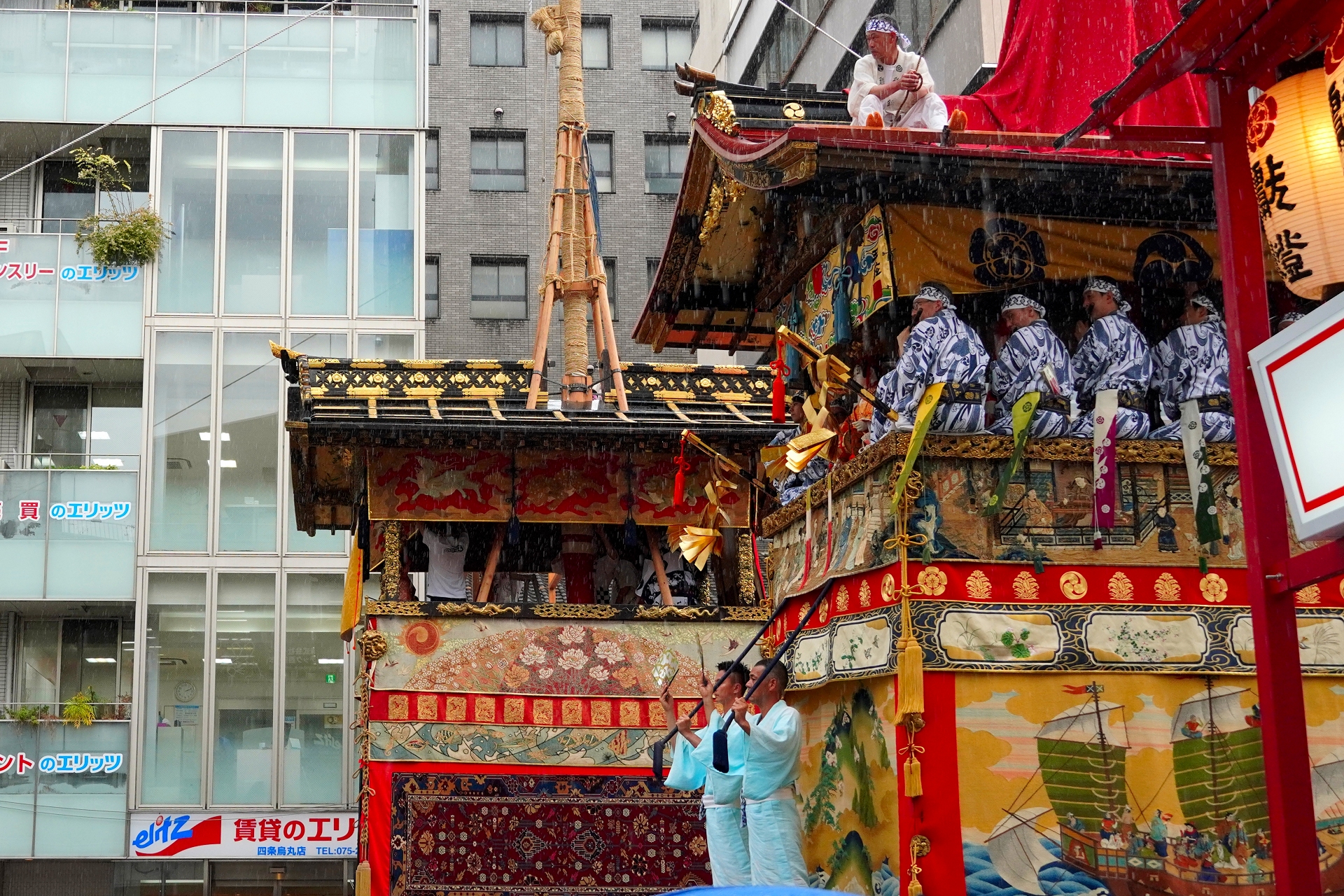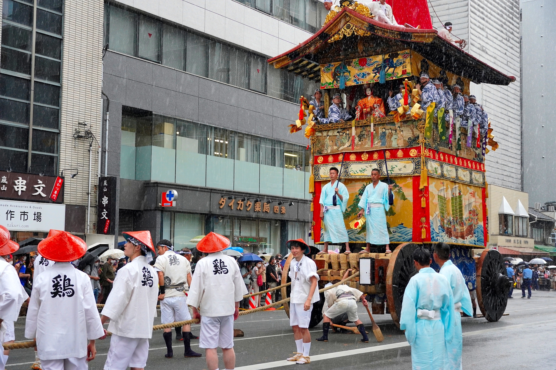 どういうわけかここで急に雨が… 誰も降るとは思ってなかったので、 鉾の関係者は大変だったろうな…
