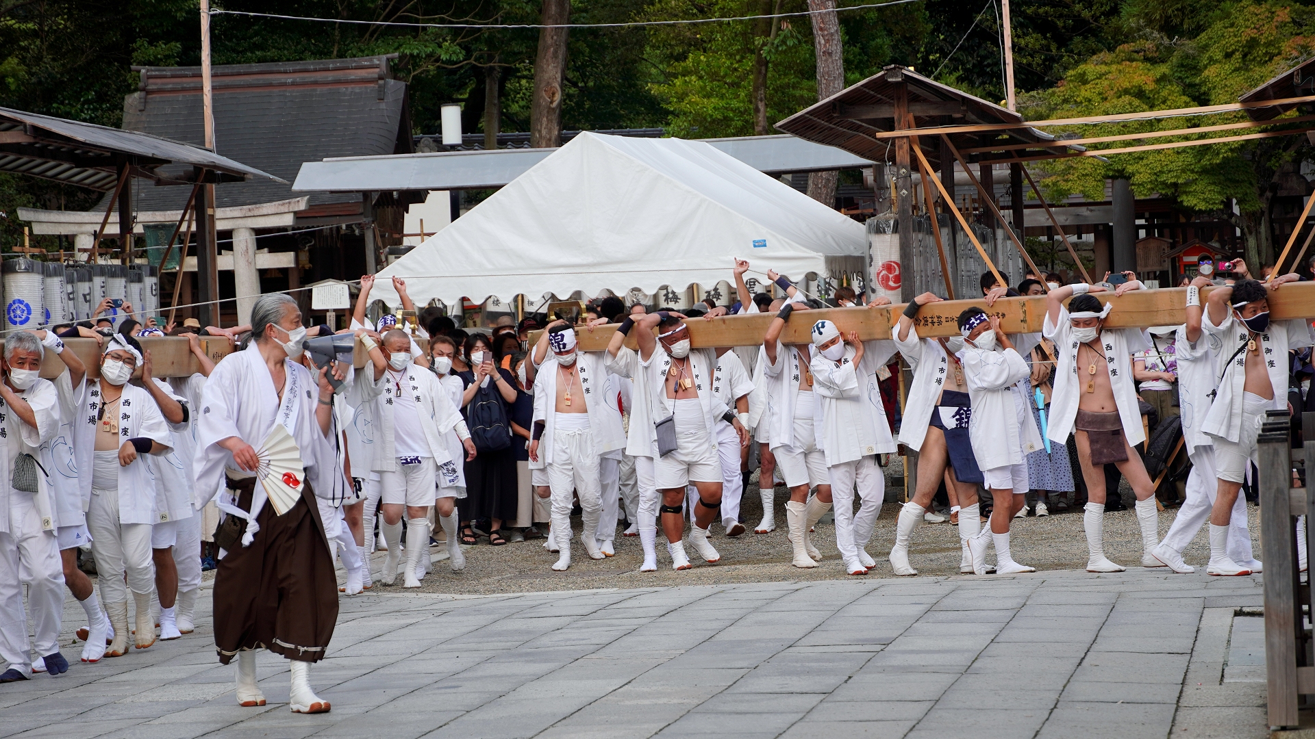 おろした後は本殿前で無事を祈った後、舞殿を一周し南楼門から外に… 最初は中御座神輿