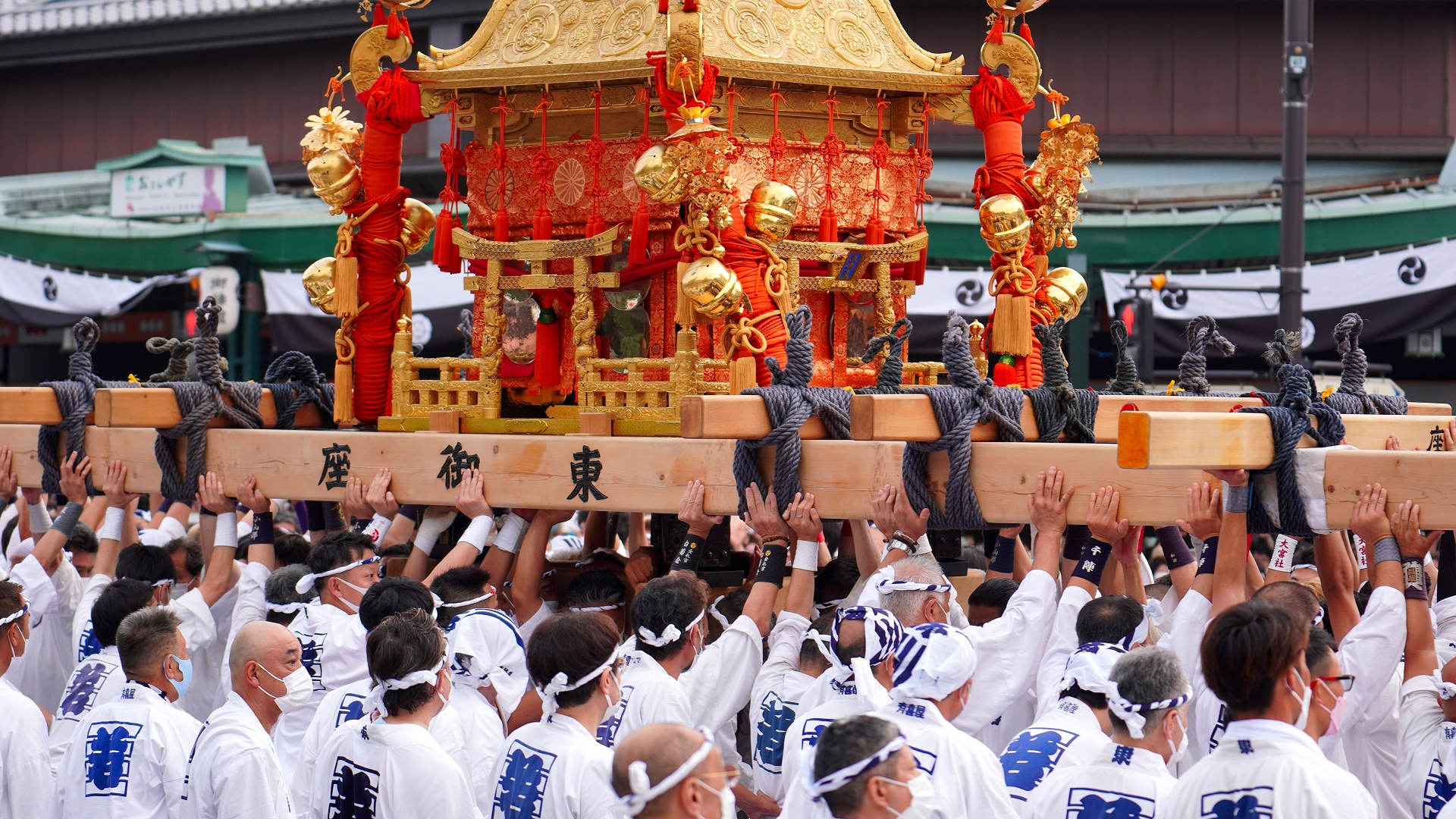 二番目の神輿は四若神輿会が奉仕する東御座、 屋根に擬宝珠をいただく四角形の神輿です…