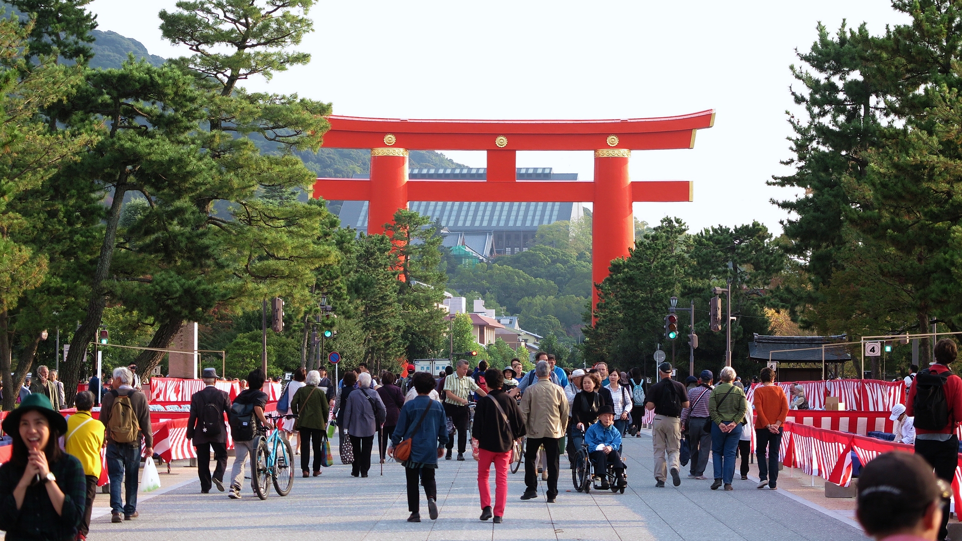 到着しました。 赤い大きな鳥居がある神宮さんです。 ここまでテクテク30分以上かかってしまいました。