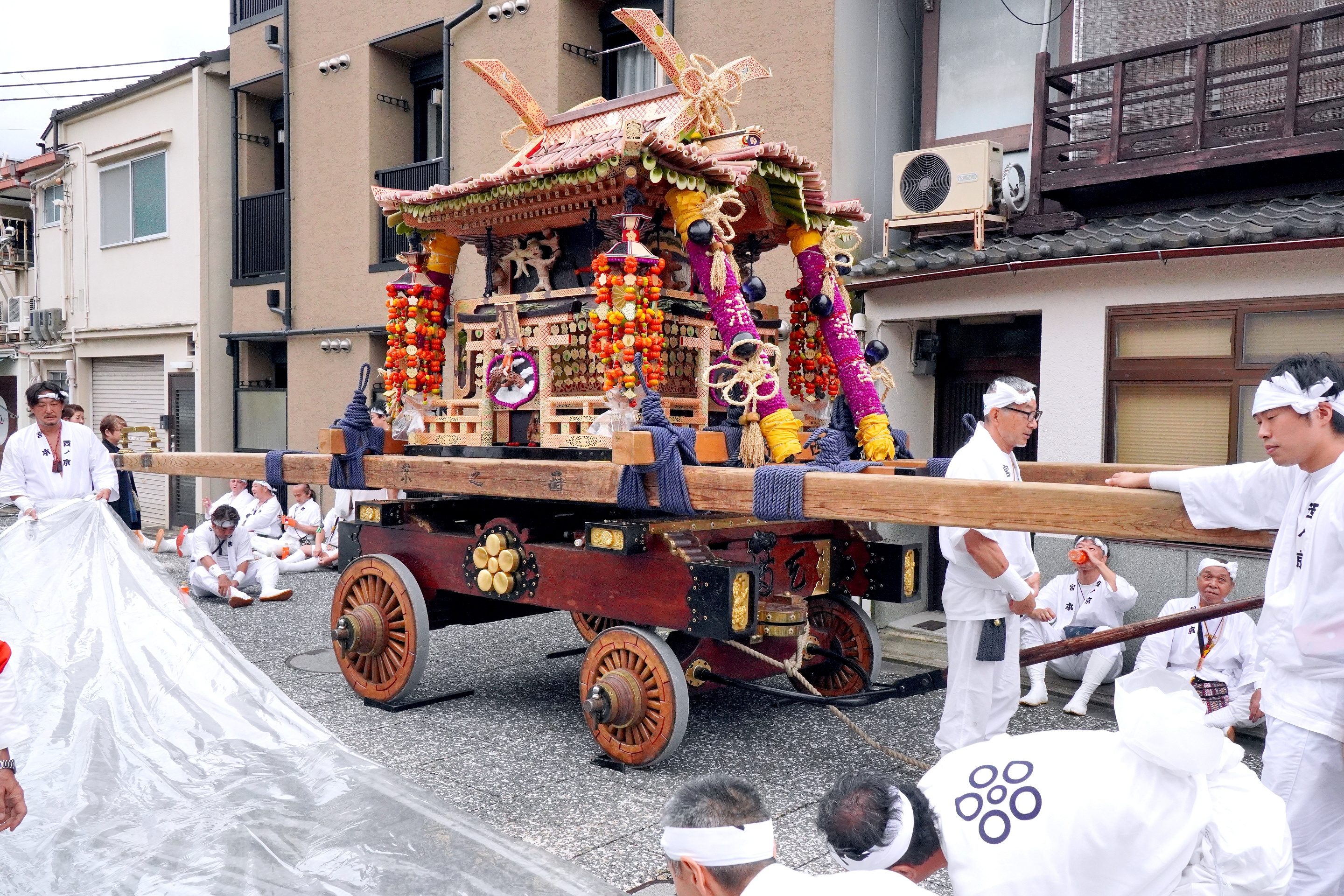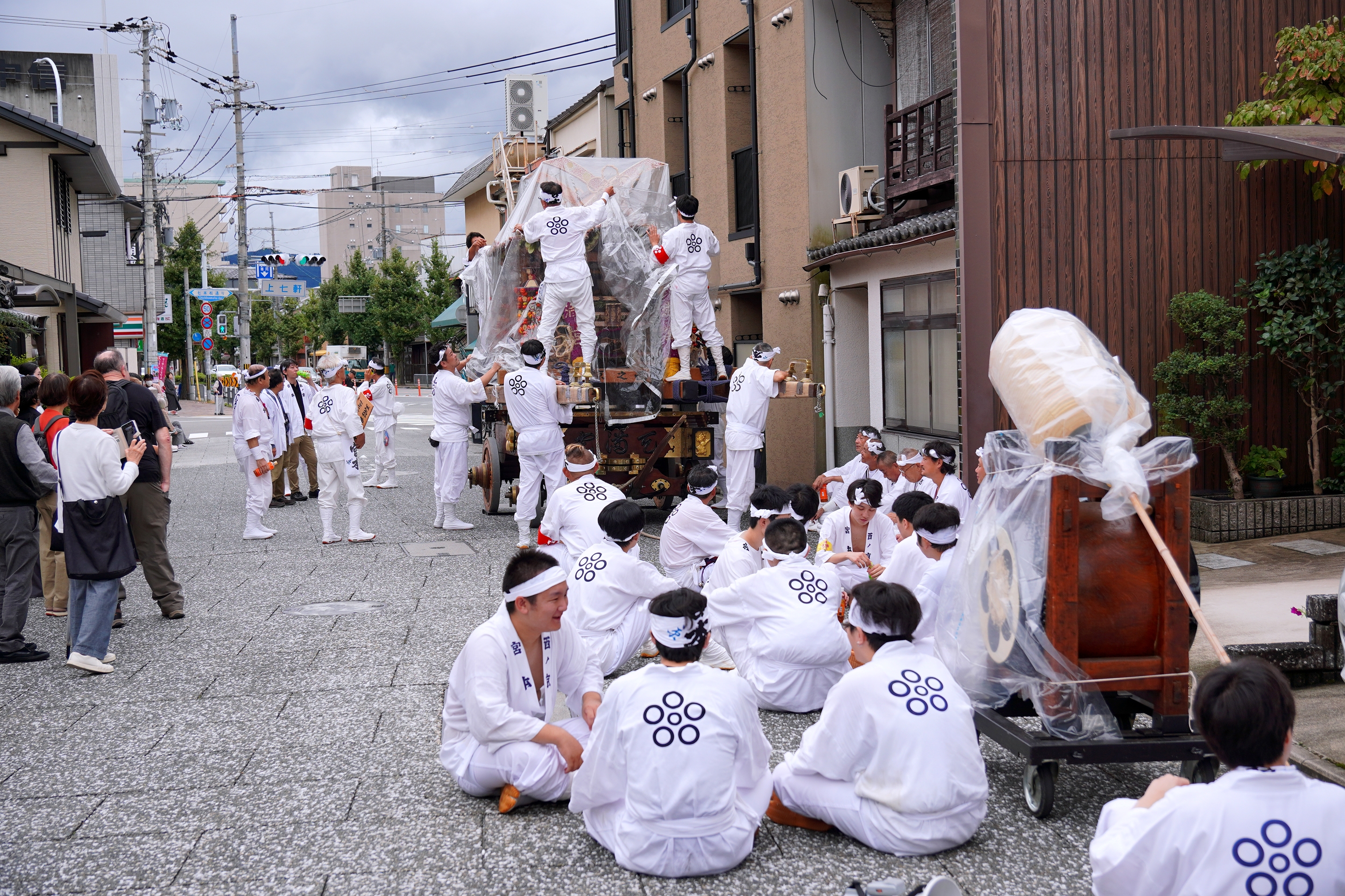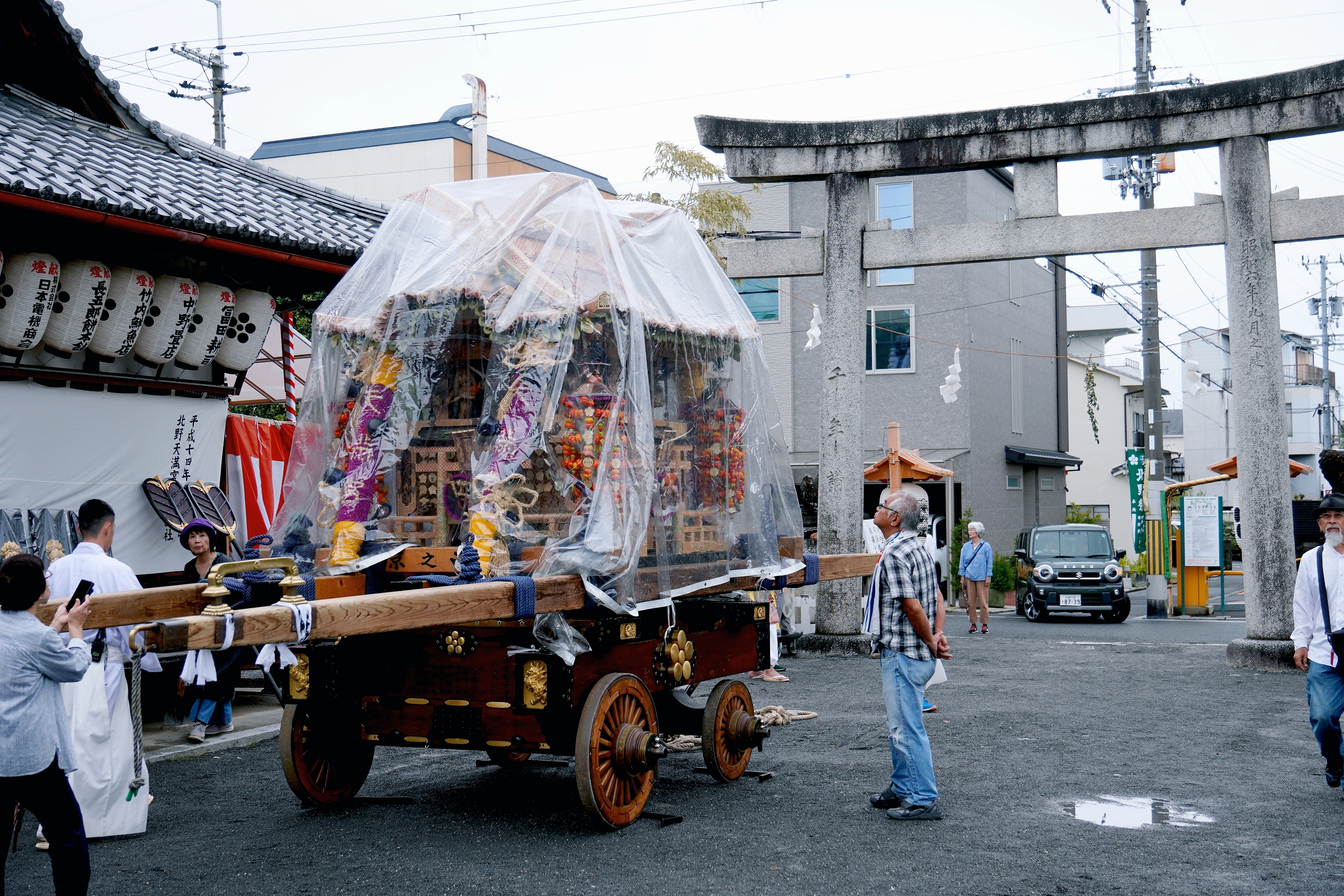 何やら大きな神輿が向こうの方に… もう雨はない、と判断したのかここで雨除けシートを外している最中に…