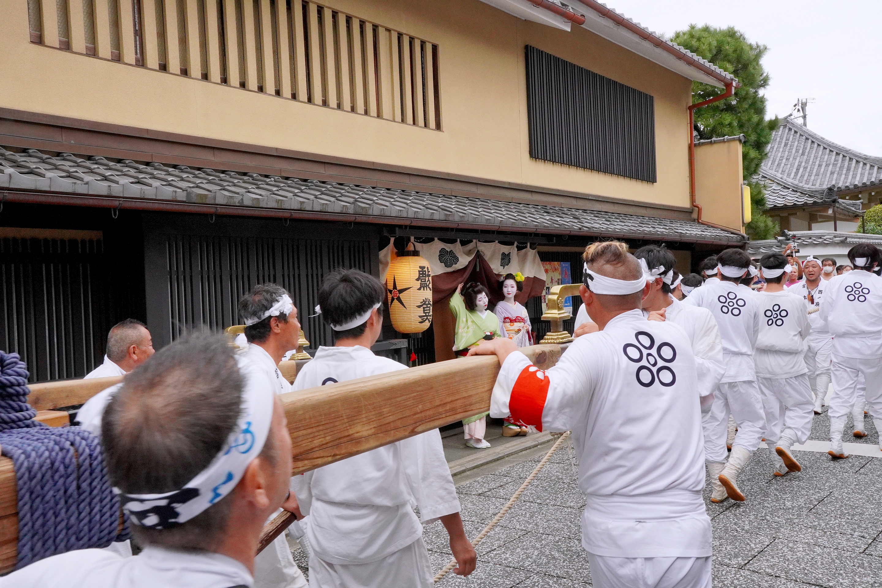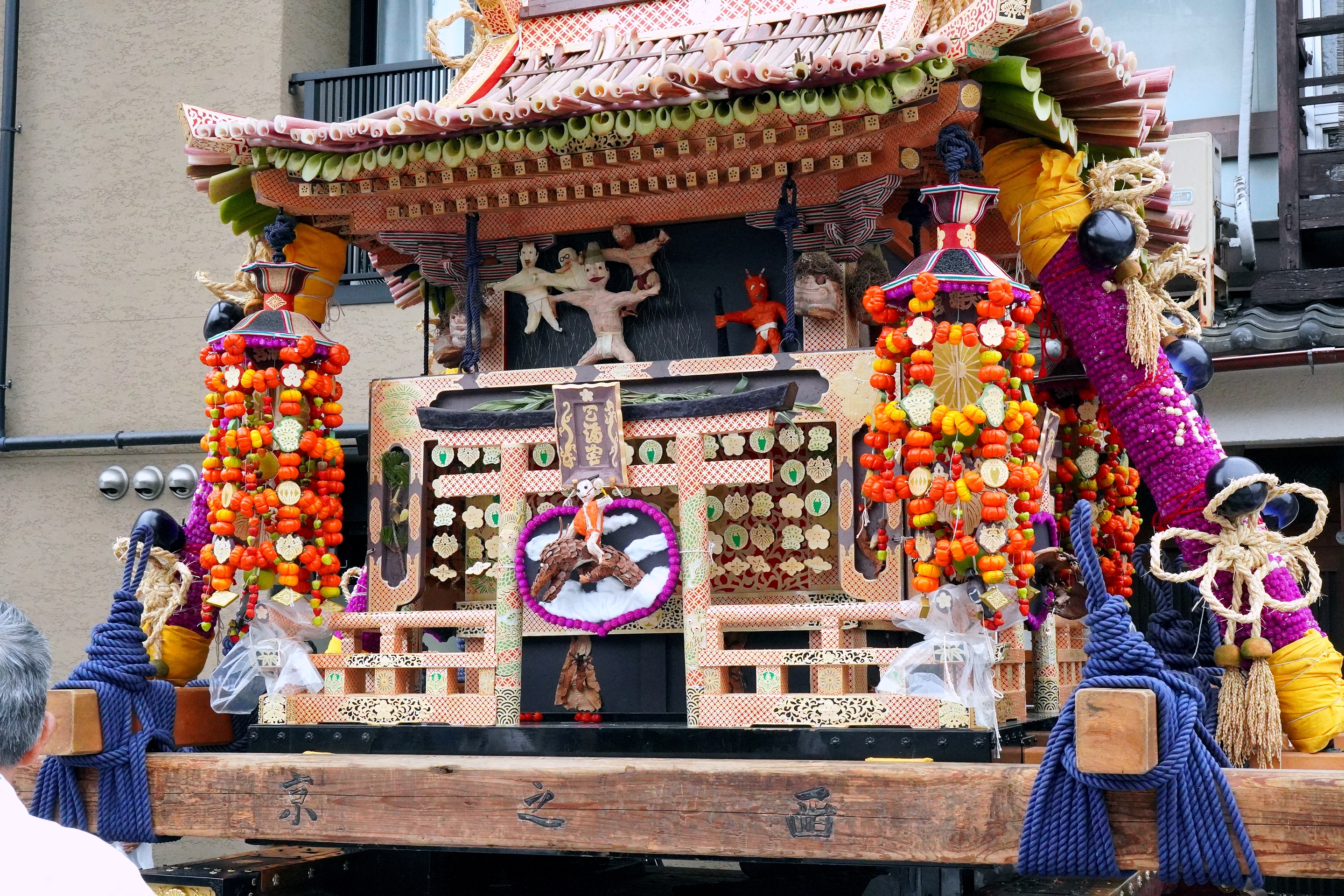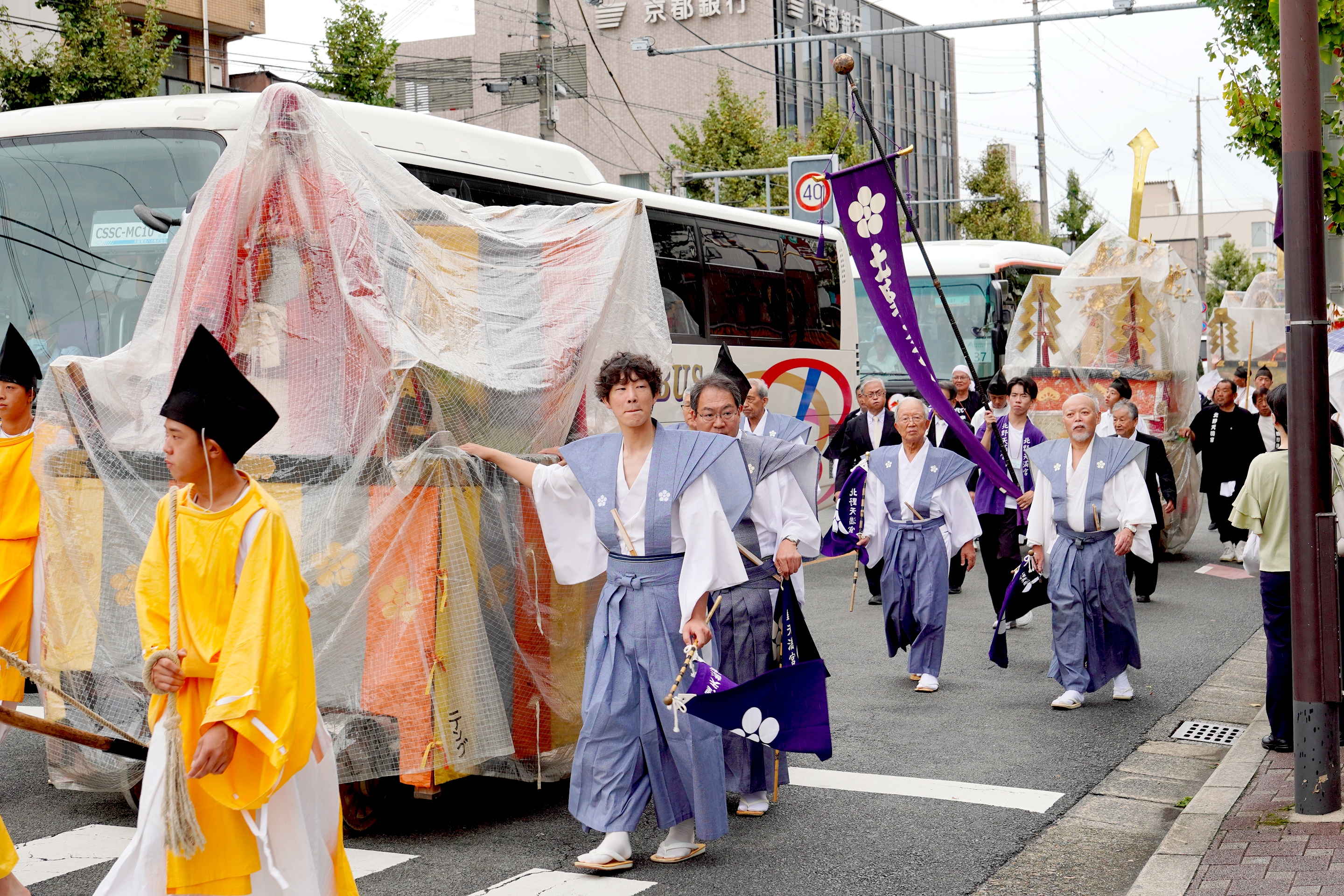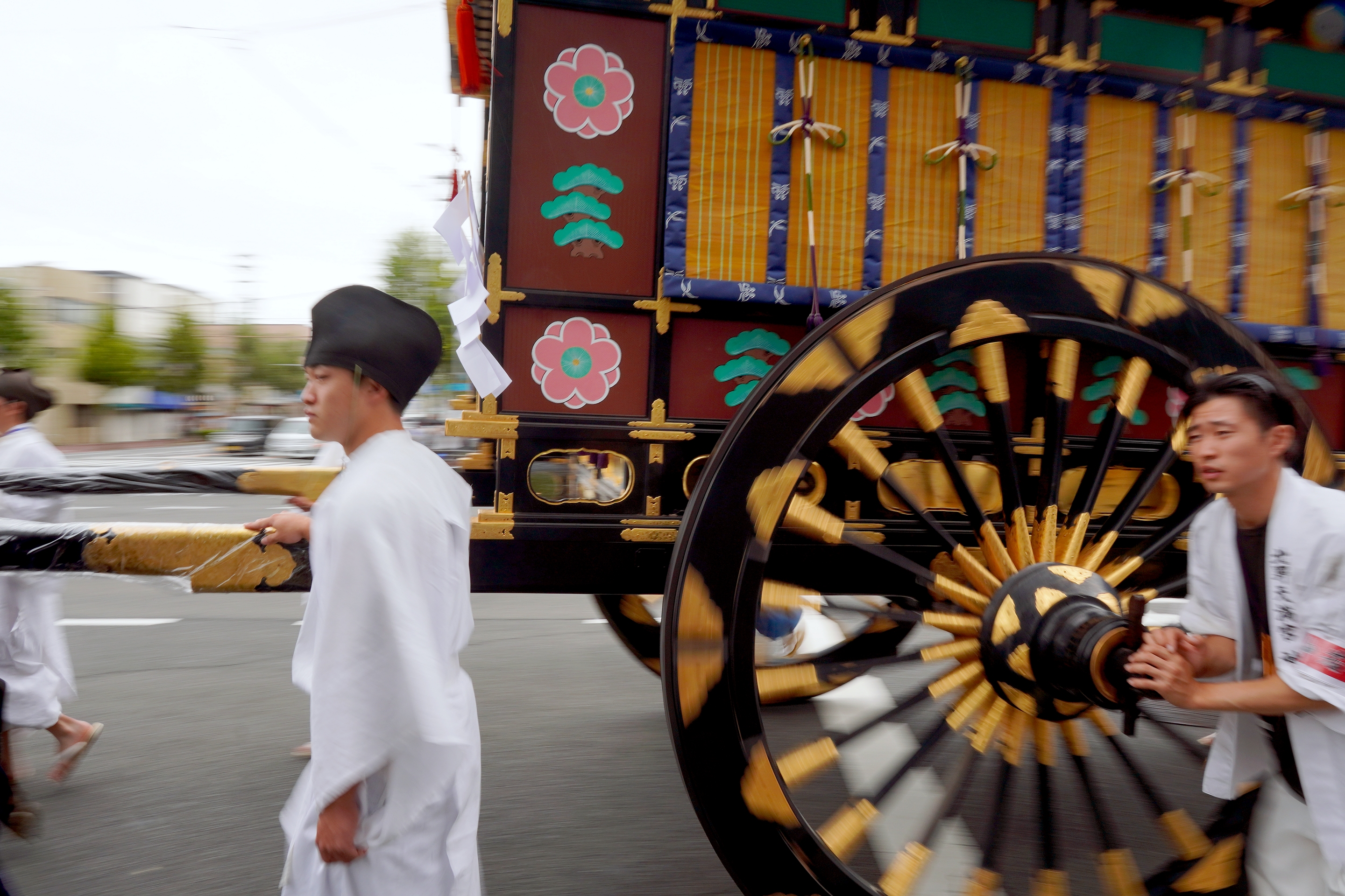何やら大きな神輿が向こうの方に… もう雨はない、と判断したのかここで雨除けシートを外している最中に…
