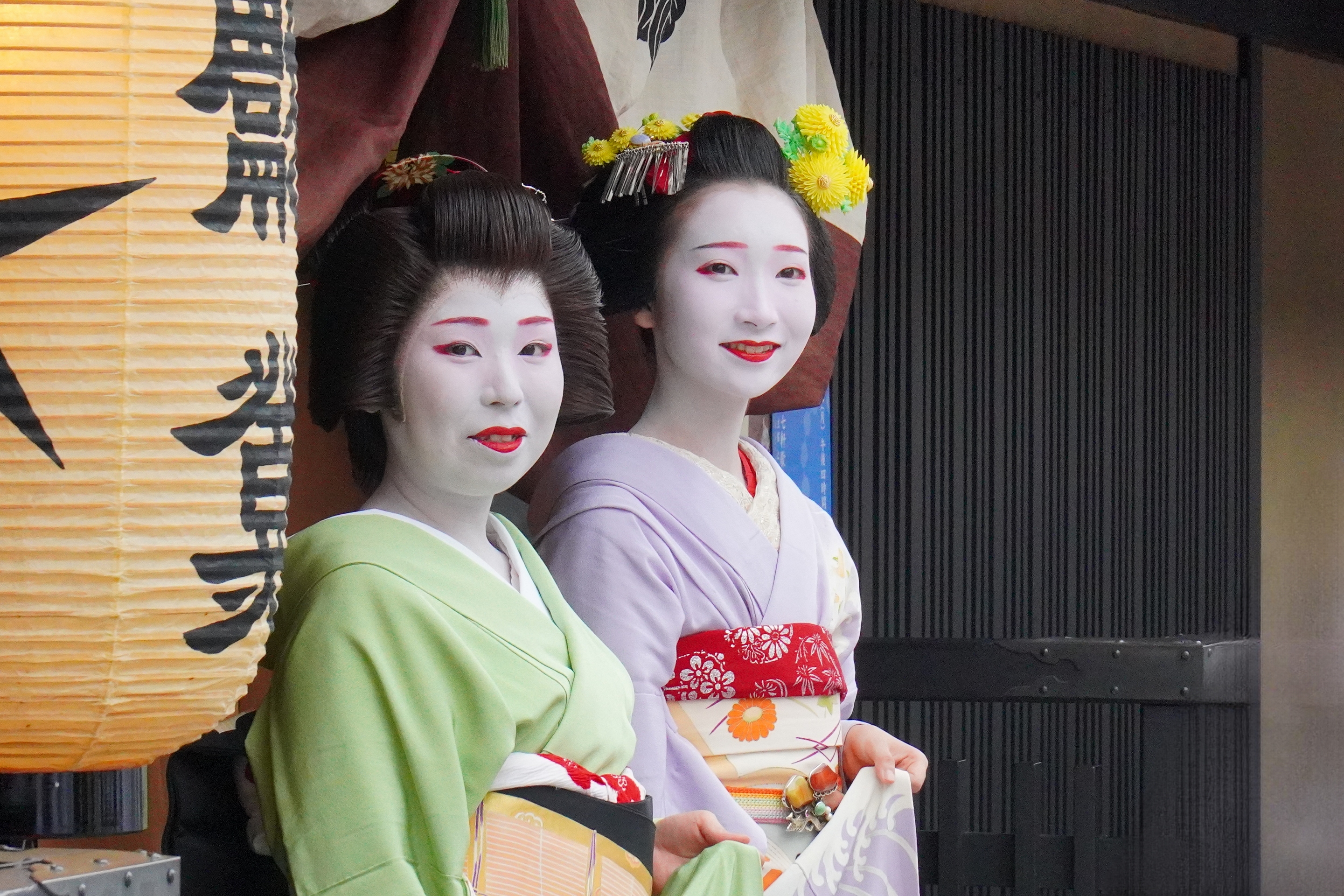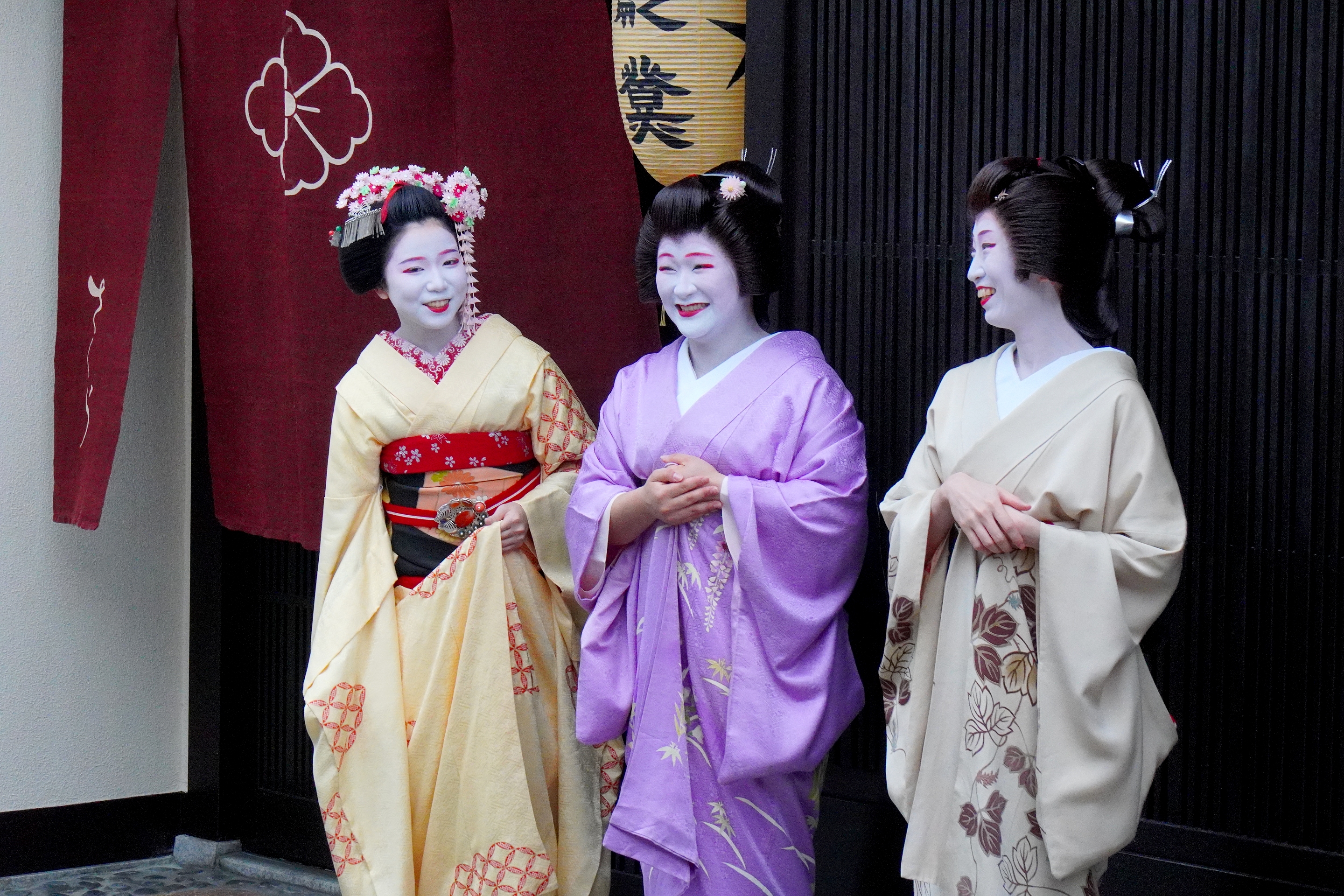 16:00、通りのお茶屋の前では別嬪さんが行列のお出迎えを