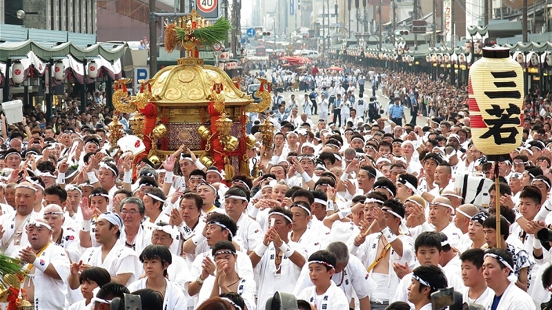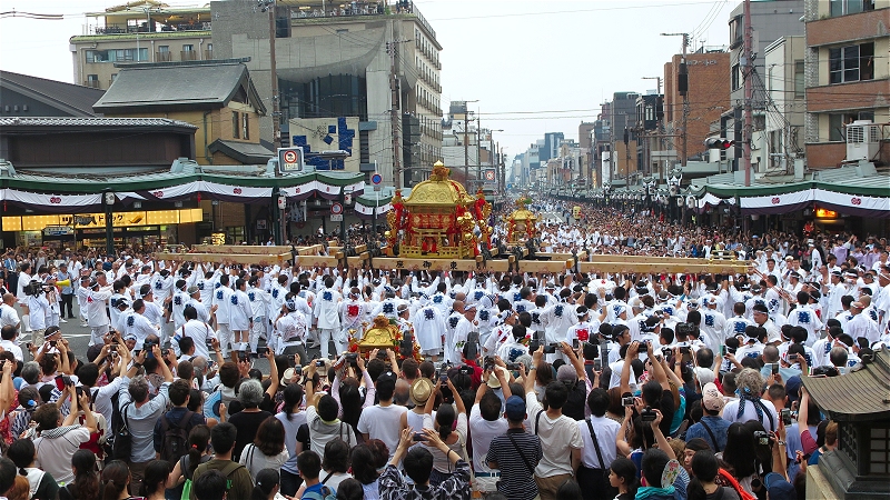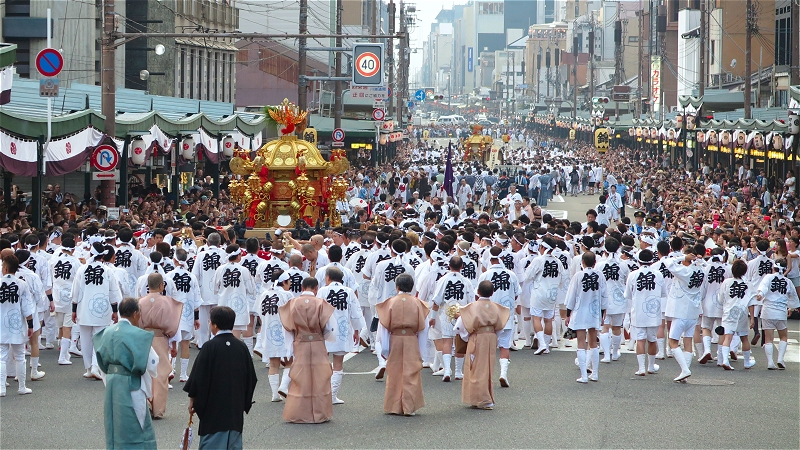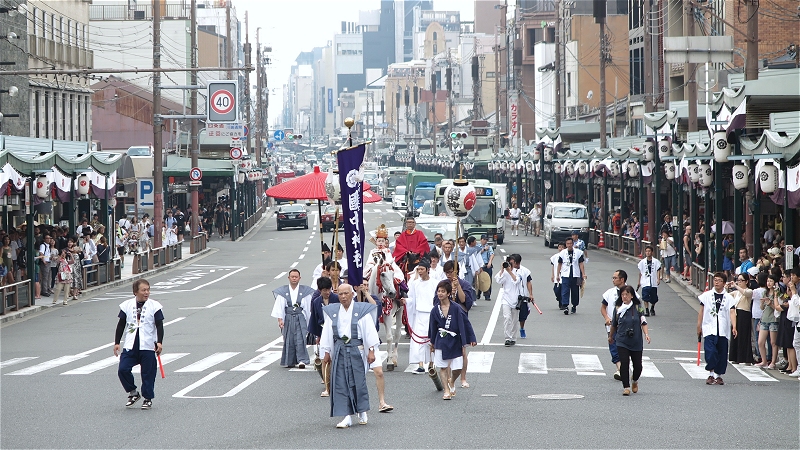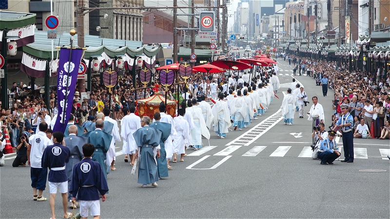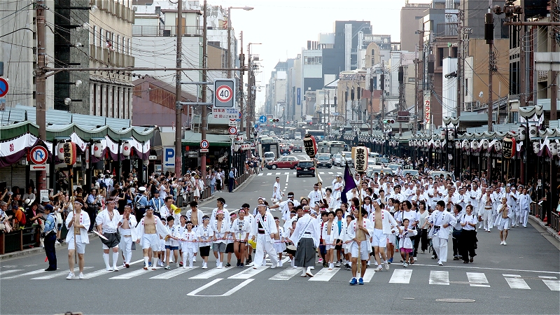 18:00、先頭が御旅所の方に向かって行きます。 この時には歩道は観客を収容しきれなく、一部車道も開放