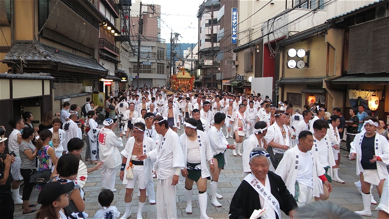 四条通りを戻るにはちょいとばかりきつい・・・ ということで裏道を・・・ 白川巽橋あたりに人が集まっていたので、待っているとやっぱり神輿が・・・