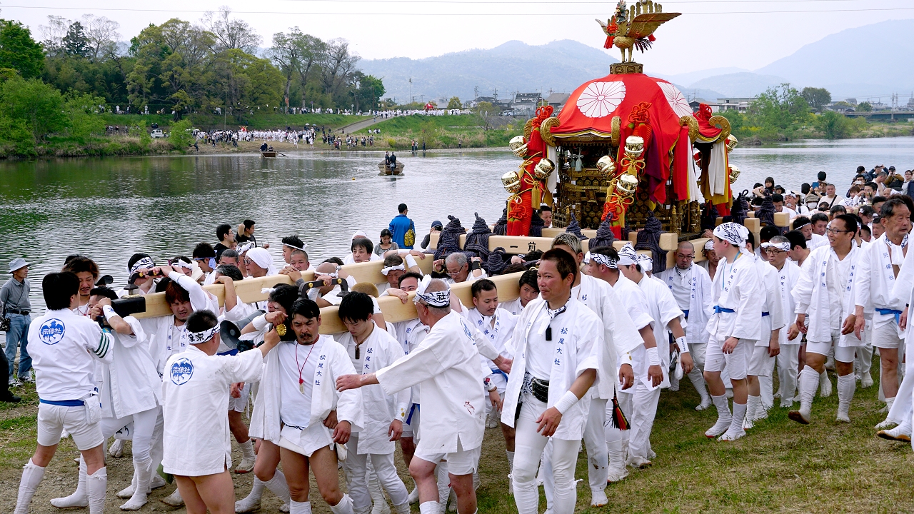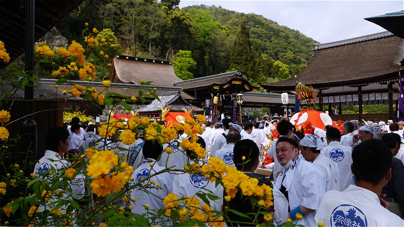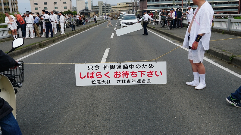松尾七社「大宮社、月読社(唐櫃)、櫟谷社、宗像社、三宮社、衣手社、四之社」の お神輿6基が拝殿を回った後、桂川に向かいます・・・