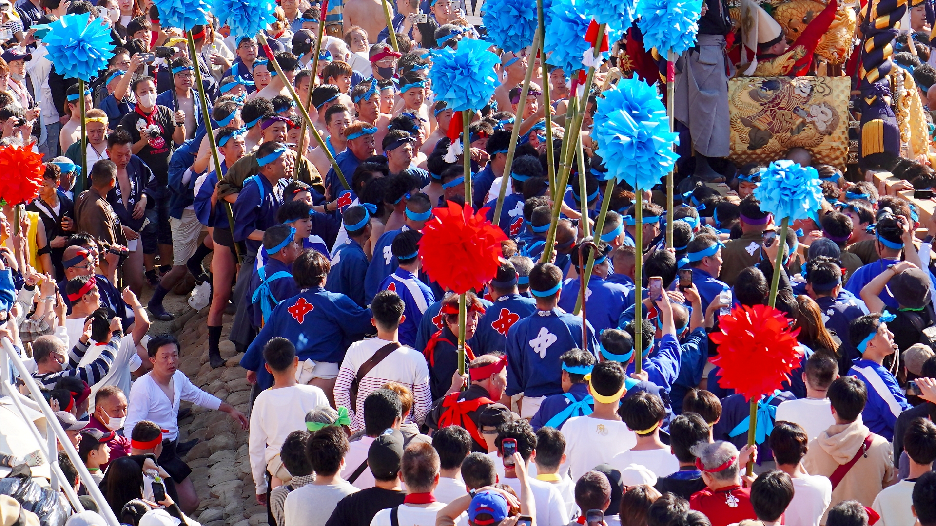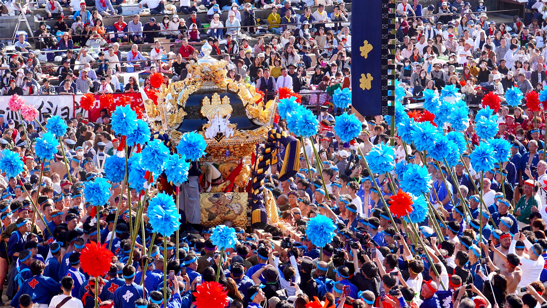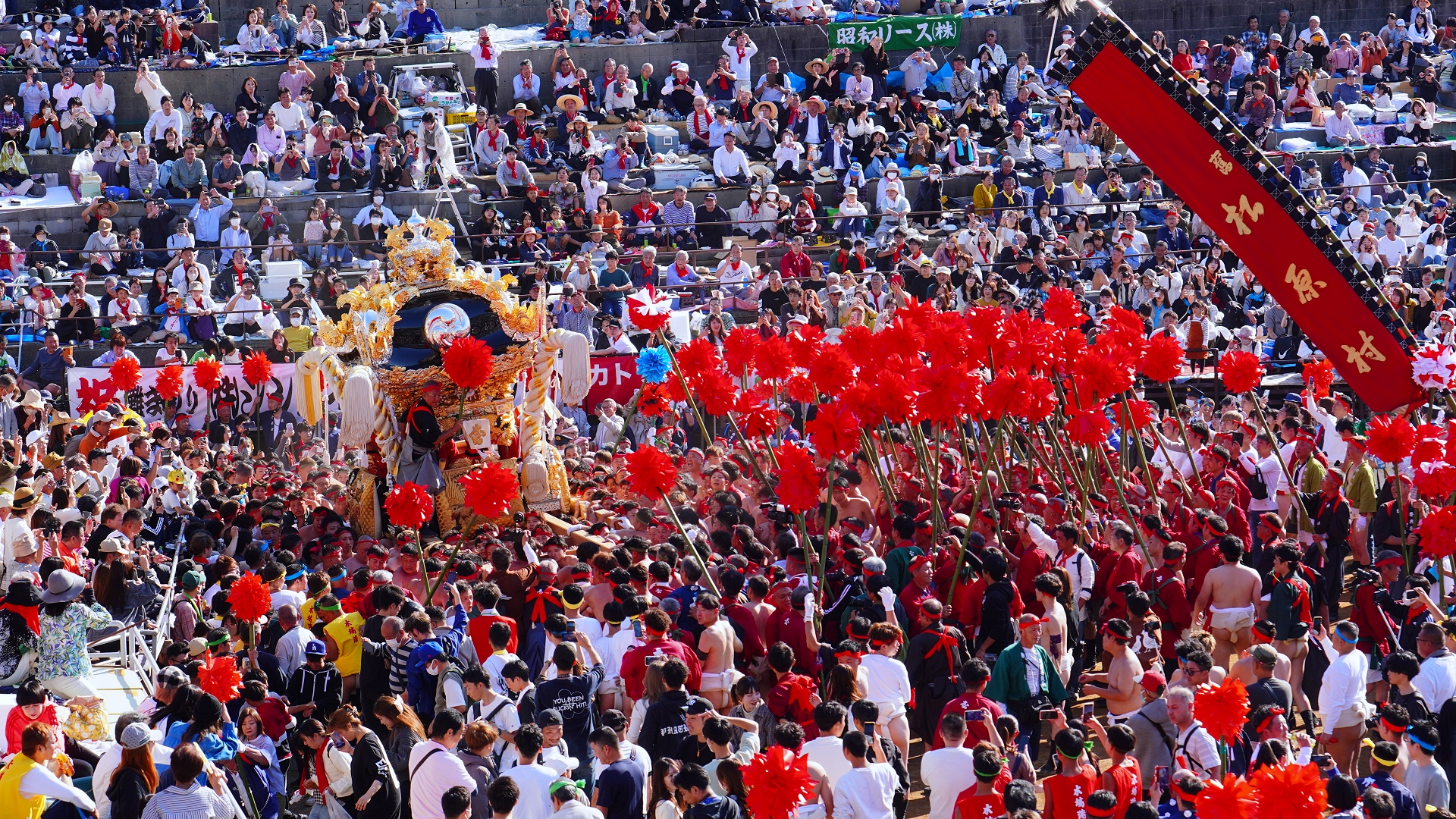 13:30、 この後この神輿や屋台は、 少し離れた本宮御旅山に向かいます… Oichanも追っかけることに… ここからが見どころお旅山までの渡御神事です 神社を出て西へ約800m、 ひょこひょこと… お旅山の練り場に到着… な、何なんだこの景色は…