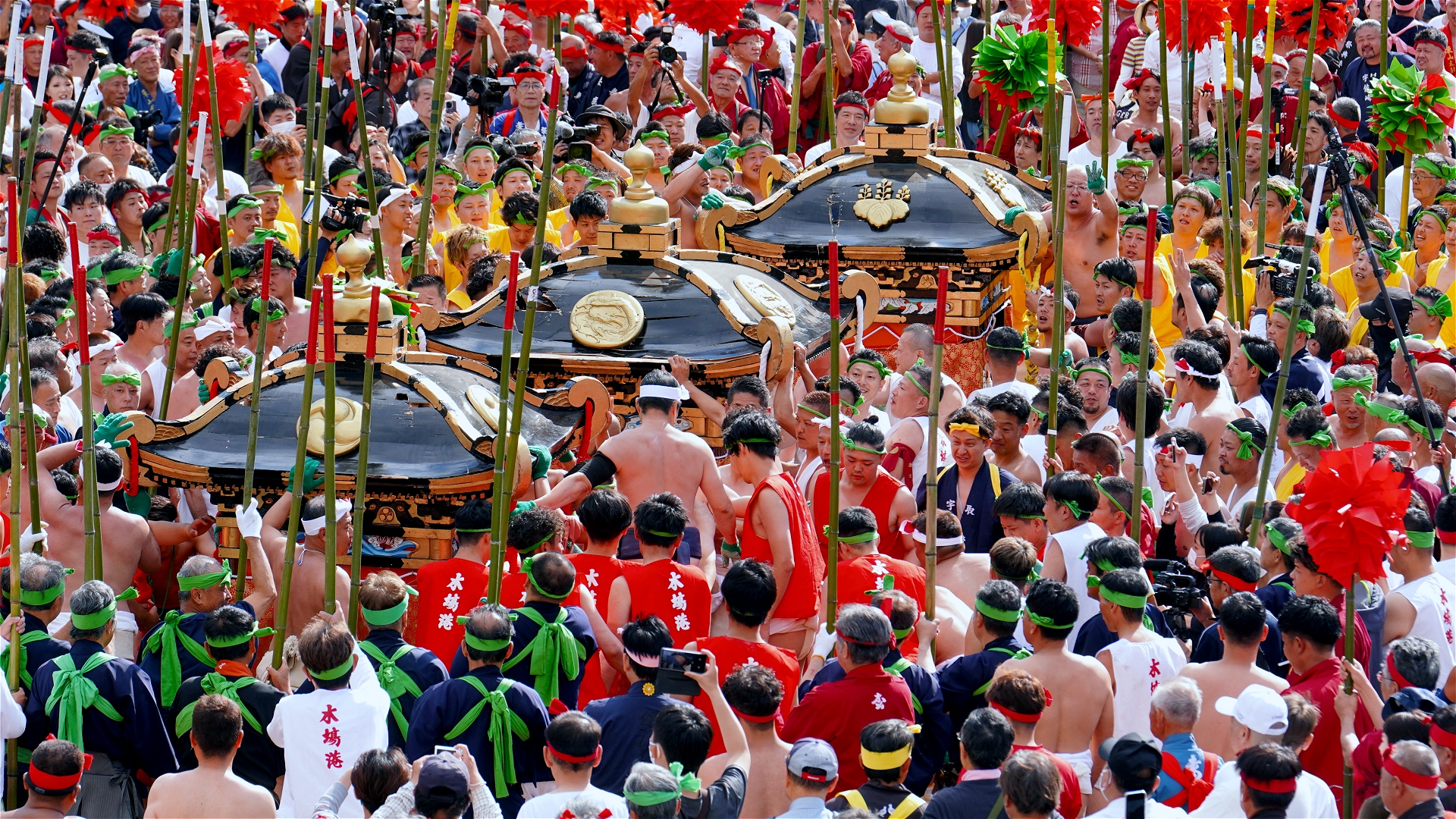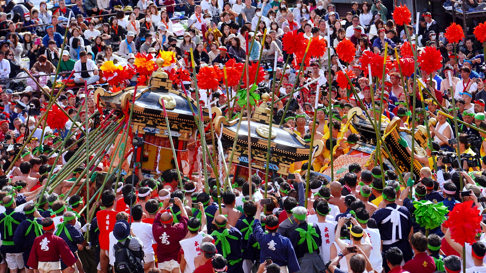 屋台が少し場所を開けた後、次は神輿の登場です しかしここ楼門前まで来た時にはすでに喧嘩模様…