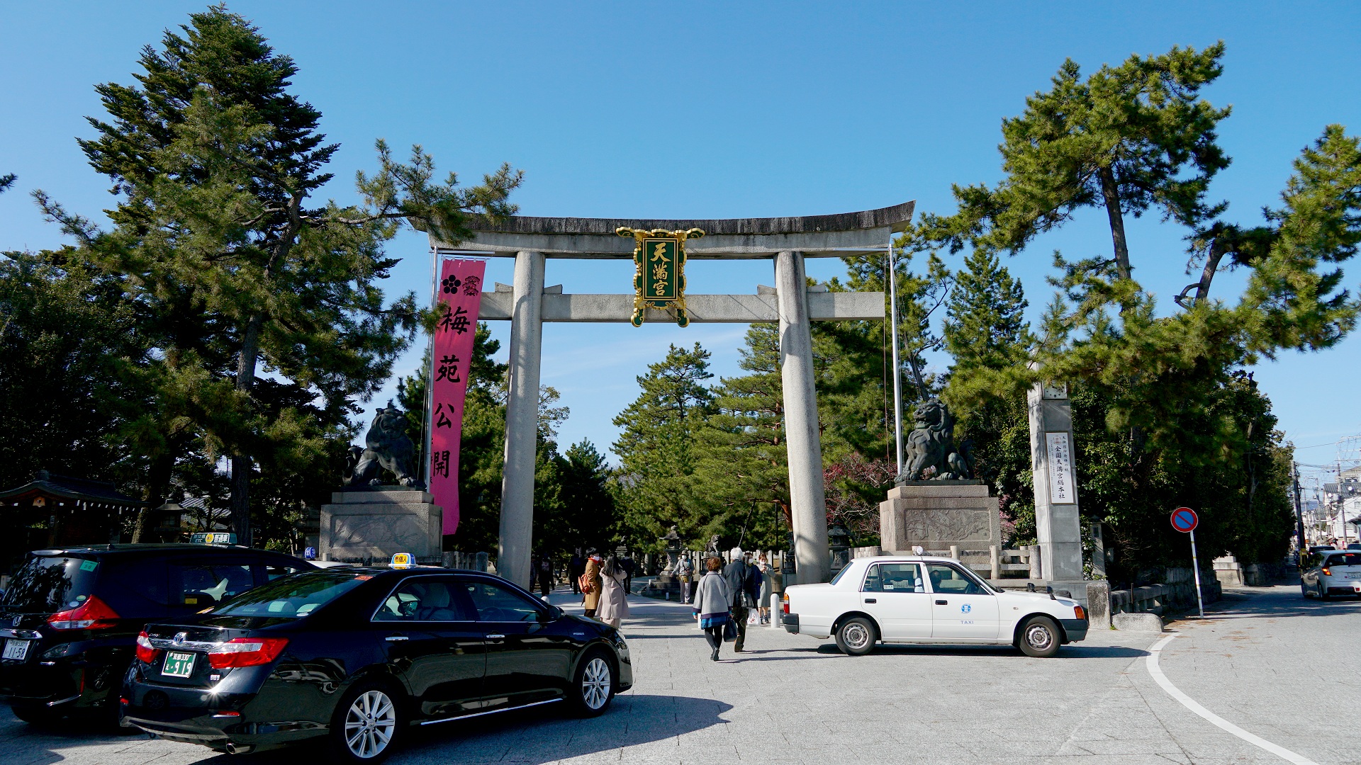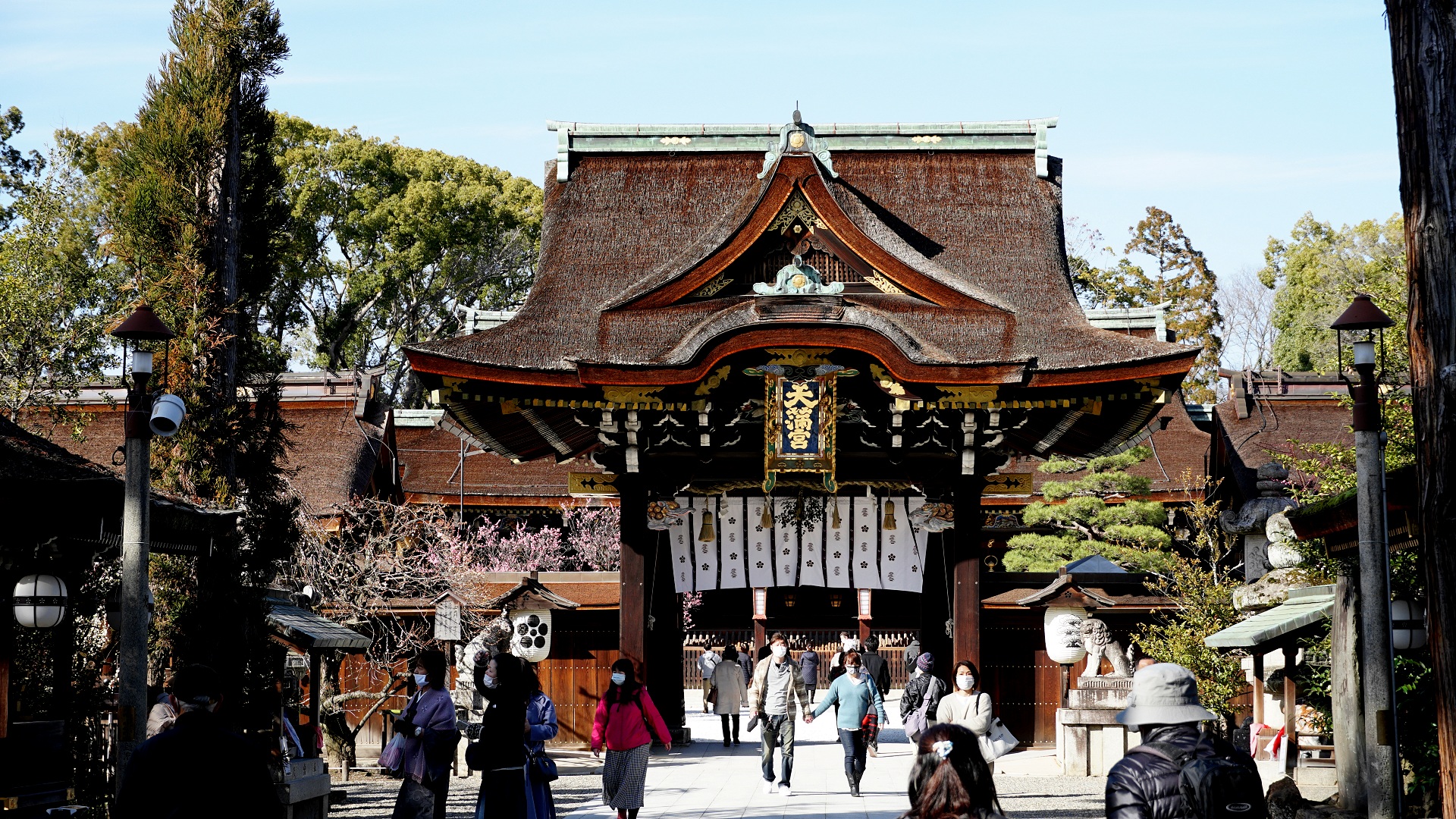 でやって来ました、北野天満宮 雲一つない青空です・・・