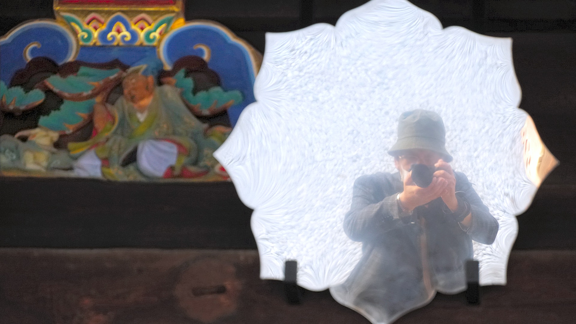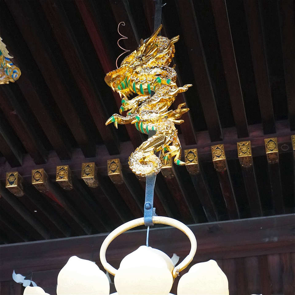 上の方がキラキラ光っていたので見上げると・・・ 釣り灯籠を吊っているいるものが・・・黄金の龍かな・・・