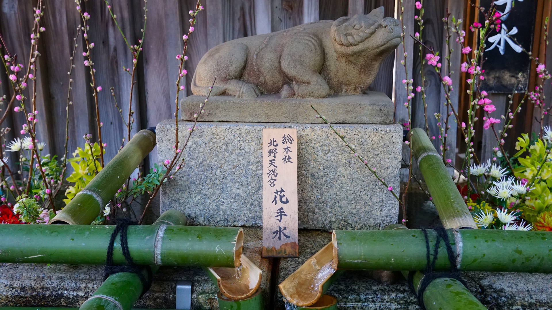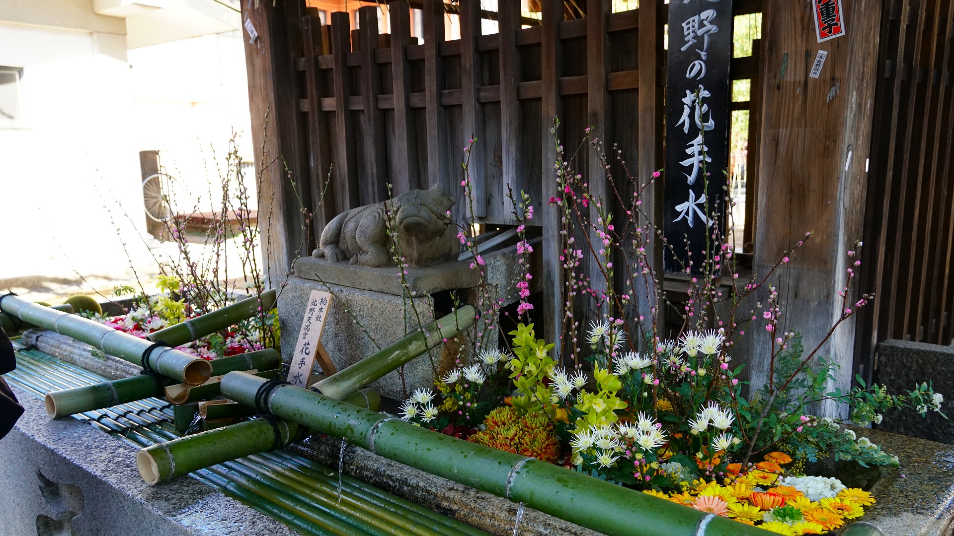楼門をくぐった右側に手水舎が・・・ 花手水ということでたくさんの花が・・・