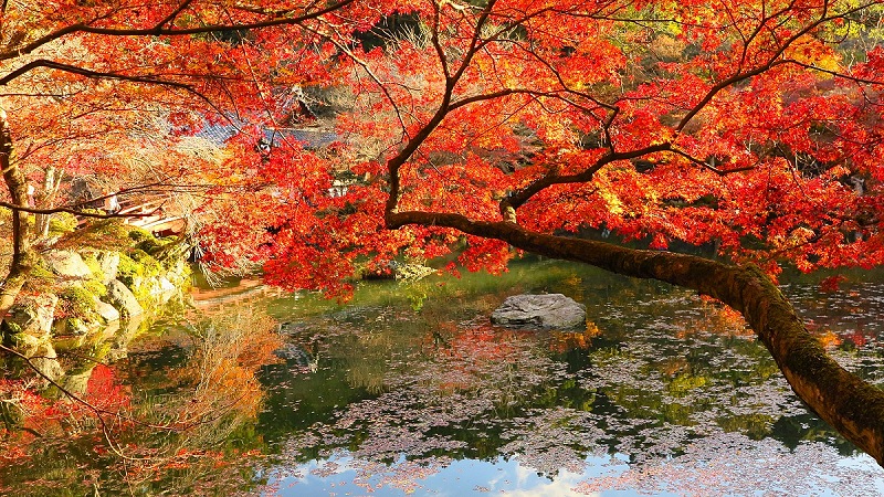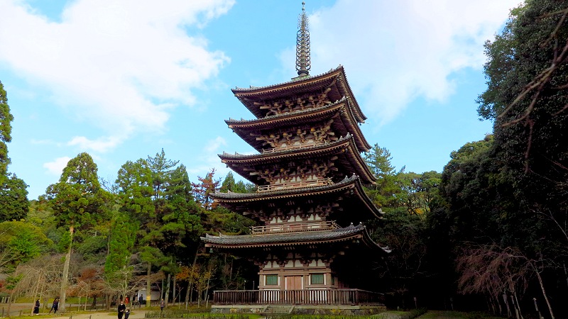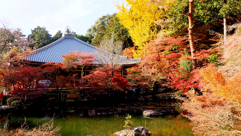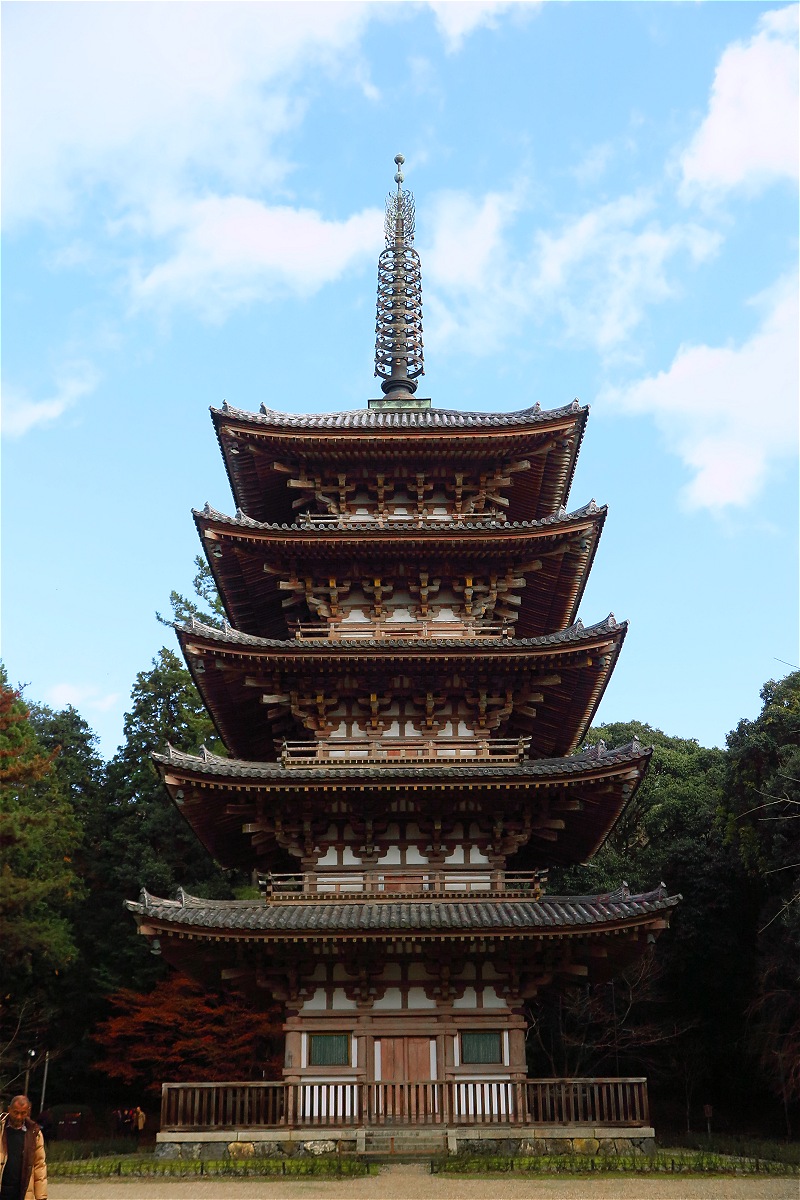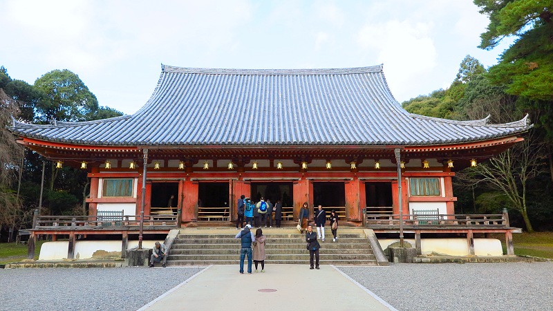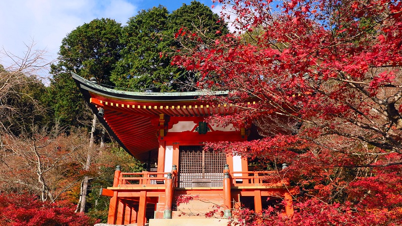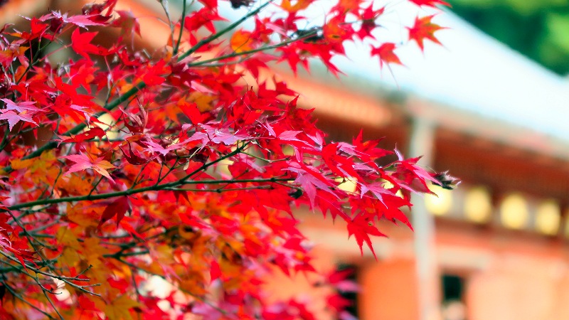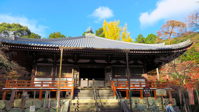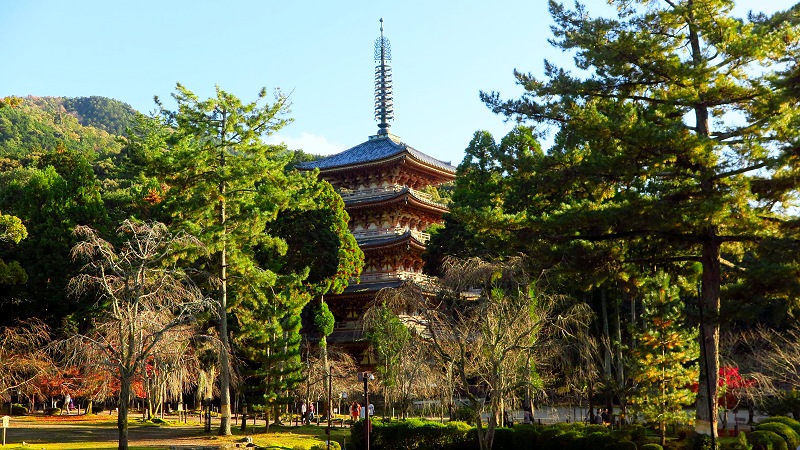 というわけでここは早々に引き上げ伽藍エリアの方に・・・ 一本だけ綺麗に紅葉した木が・・・後ろは「金堂」