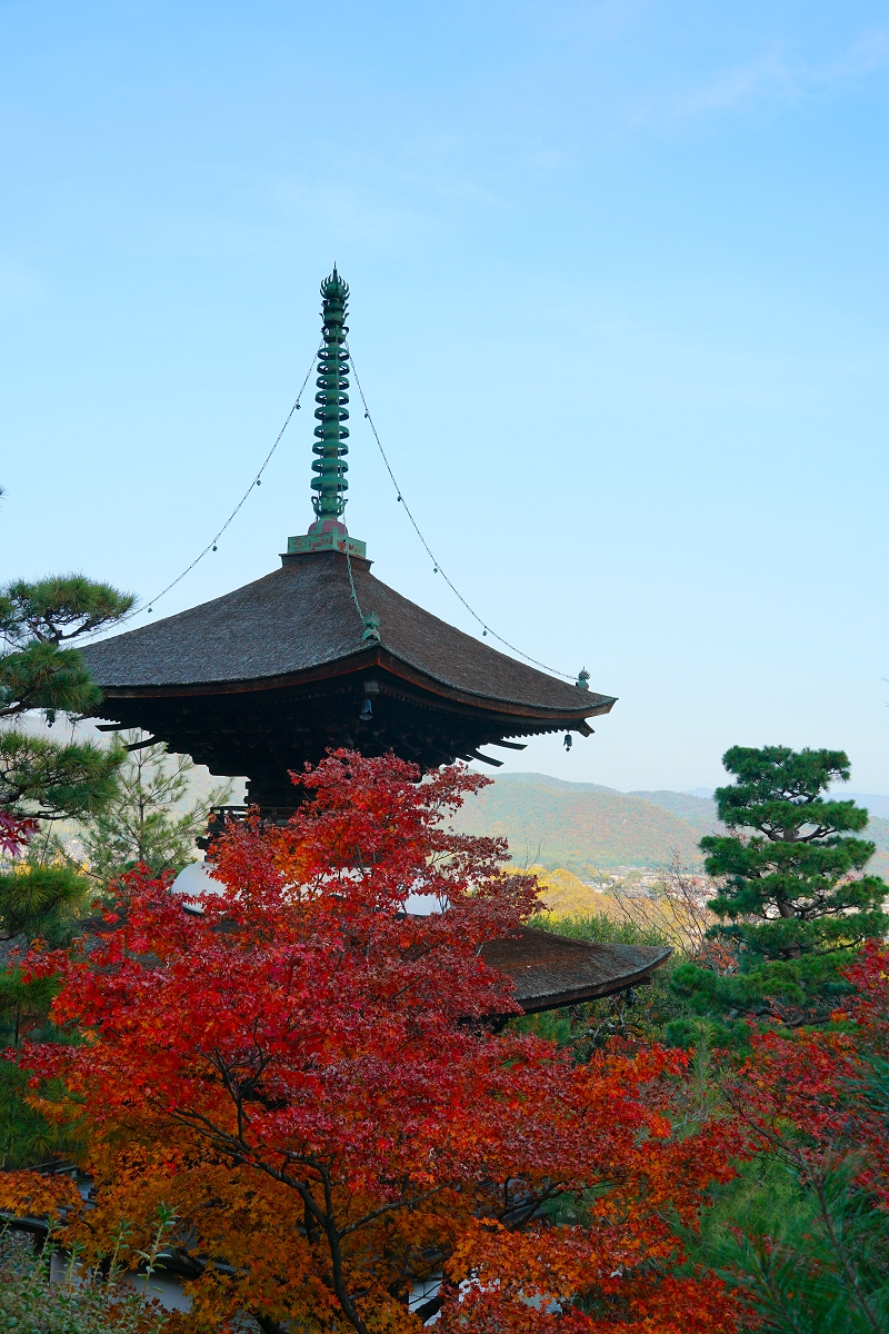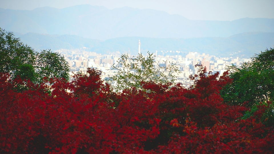 多宝塔の裏には展望台に行く道が・・・ はるか彼方にうっすらと京都タワーが・・・