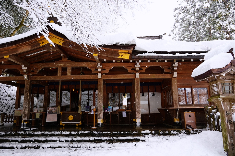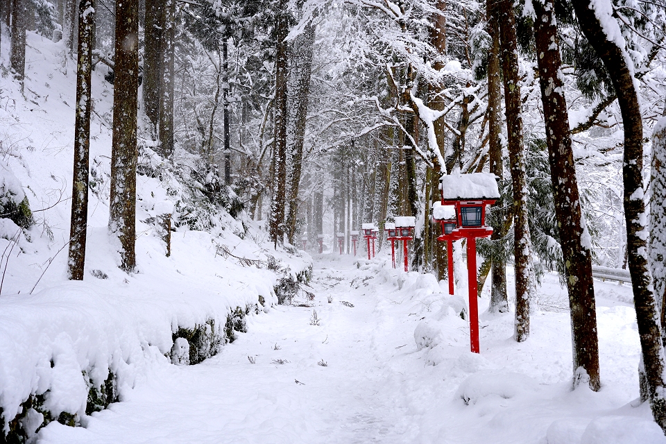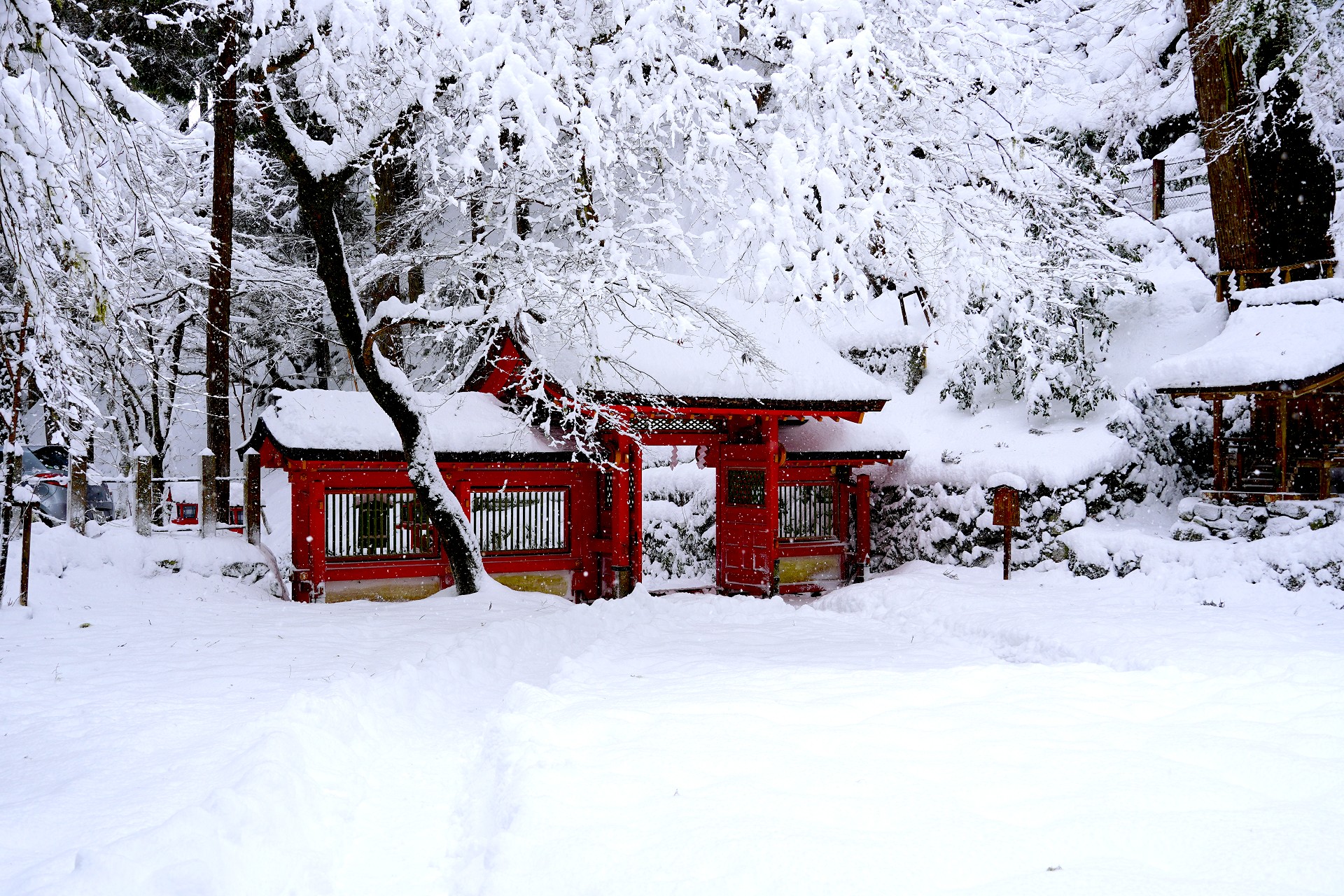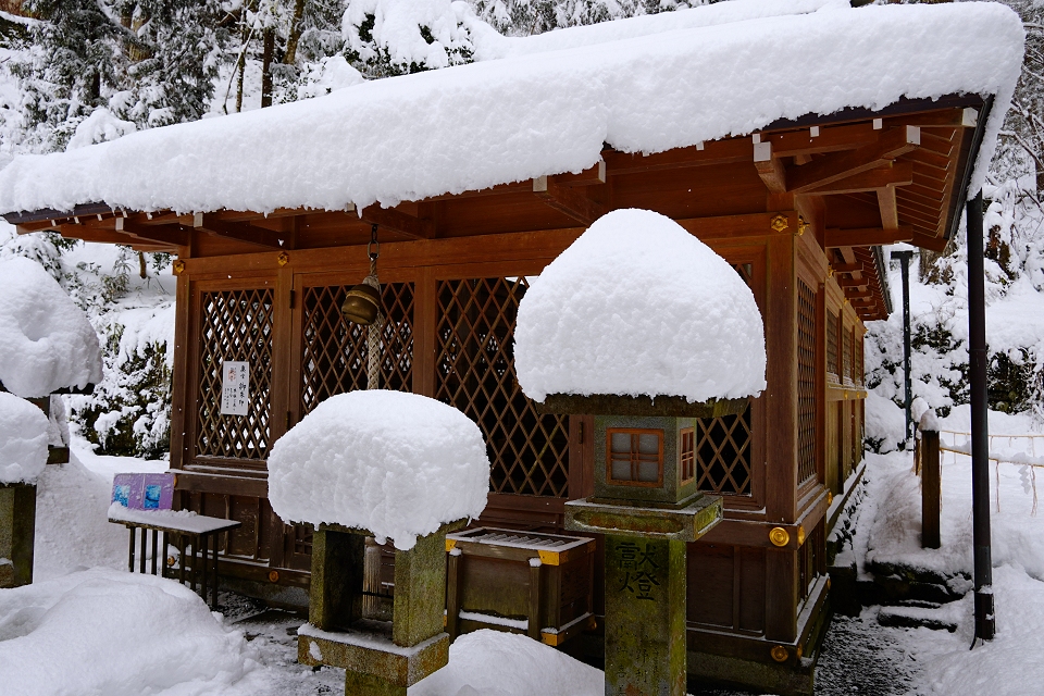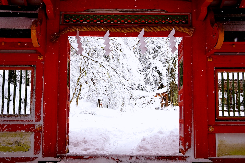 しっかと耳を澄ませ、傘もしっかりと握りしめ・・・ ようやく奥宮の門に到着・・・ 実はここに到着する寸前、上にばかり気を取られて一回ツルリンコ・・・片尻を雪の中に・・・