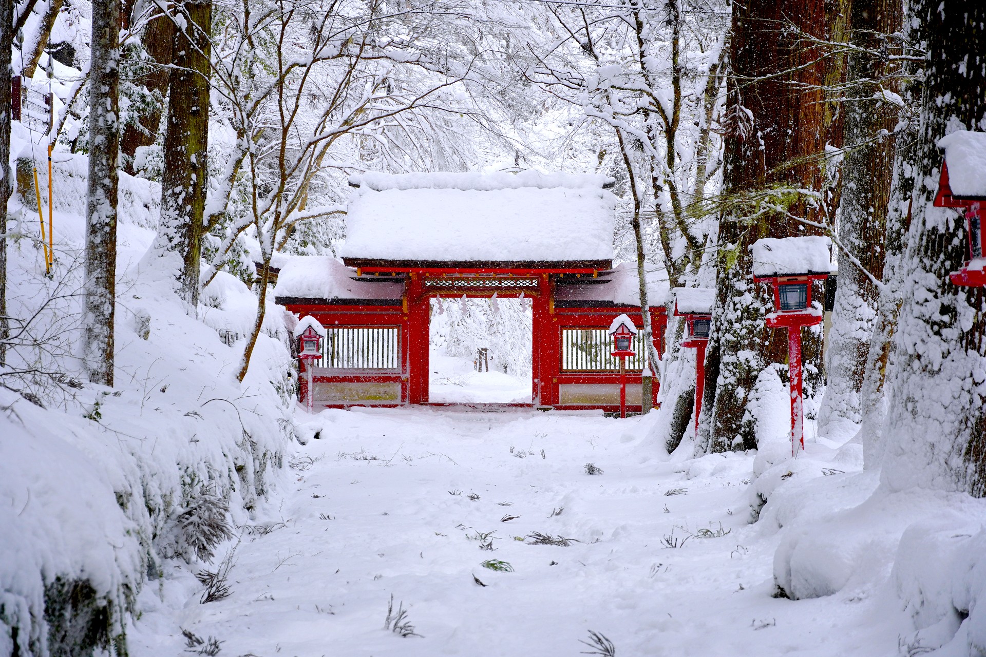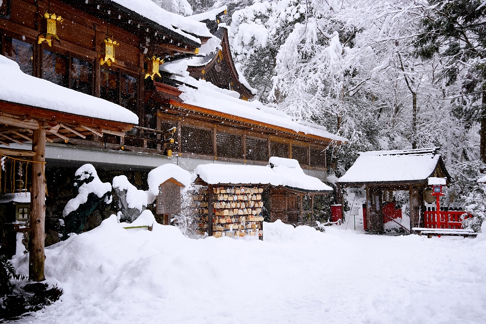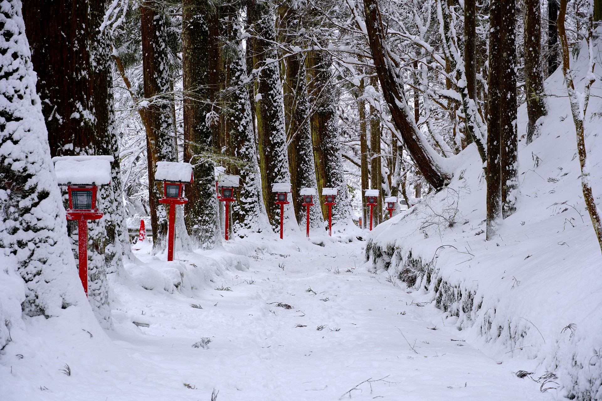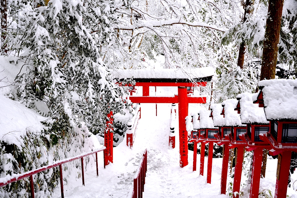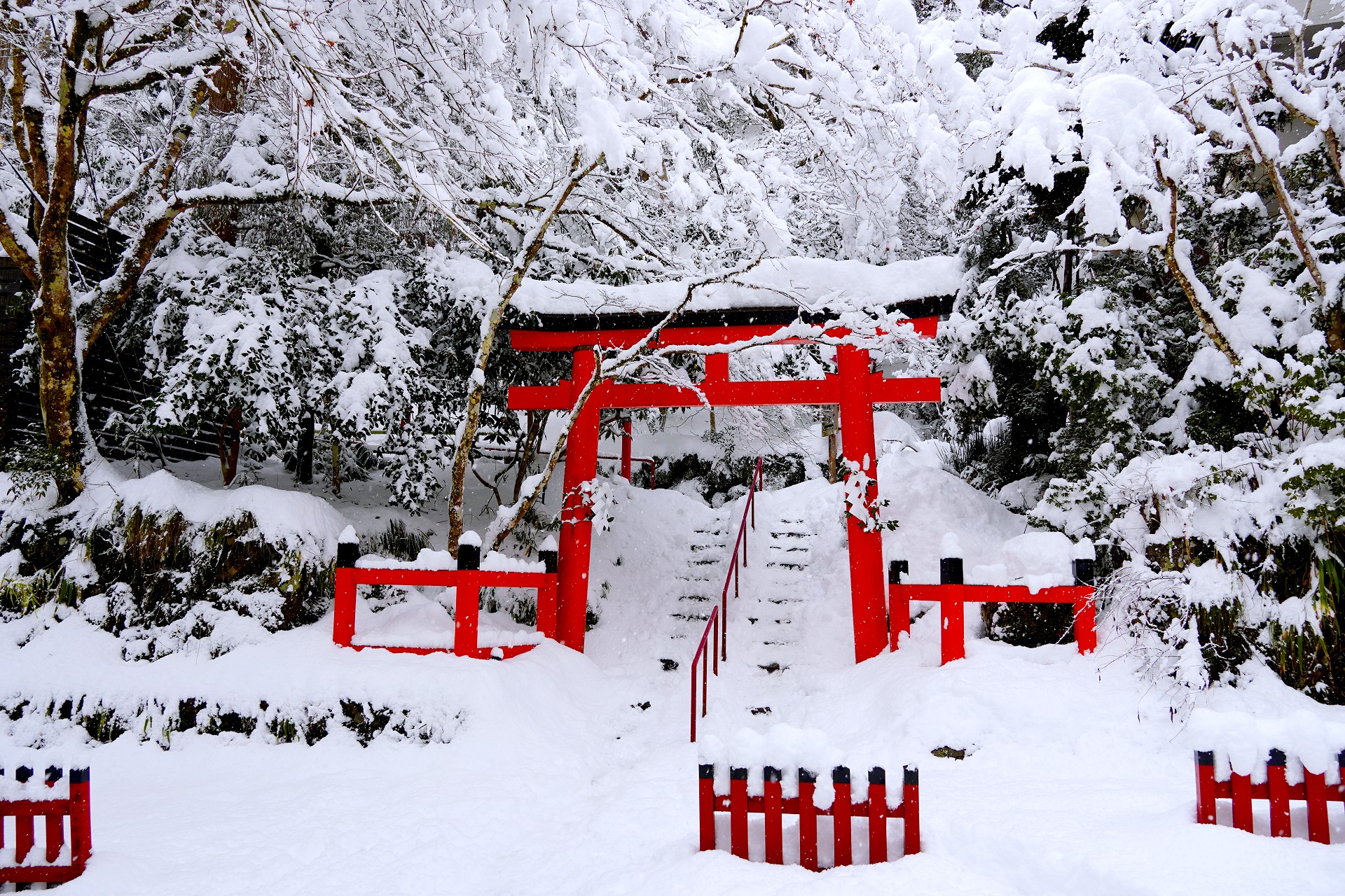 しっかと耳を澄ませ、傘もしっかりと握りしめ・・・ ようやく奥宮の門に到着・・・ 実はここに到着する寸前、上にばかり気を取られて一回ツルリンコ・・・片尻を雪の中に・・・