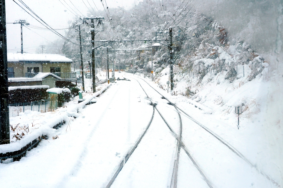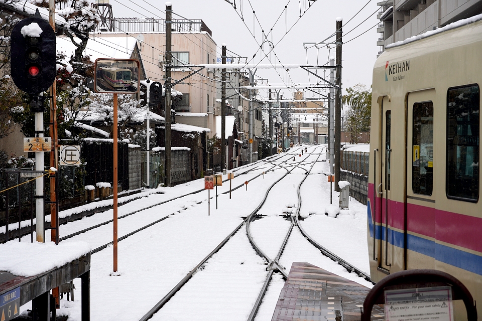 9時半には何とか出発できたのだが・・・ 京阪電車の車窓からは雲のほとんどない青空・・・ 結局地下走行区間の入る前(鳥羽街道駅付近)まで、降雪は見られなかった・・・ やっぱり、と思い急遽行先変更、もっと北へ・・・