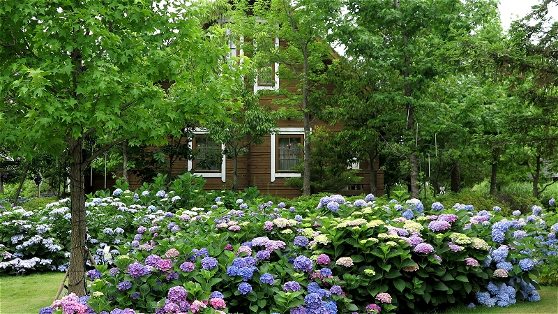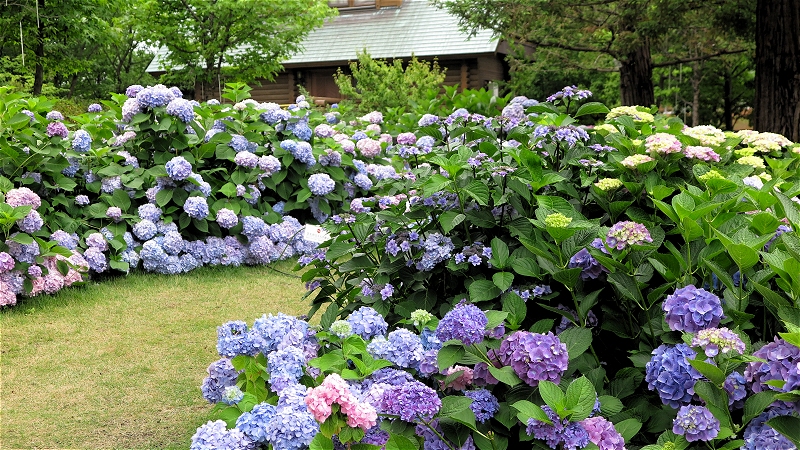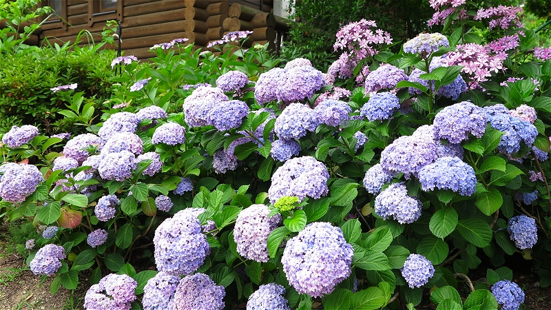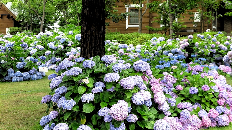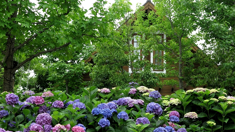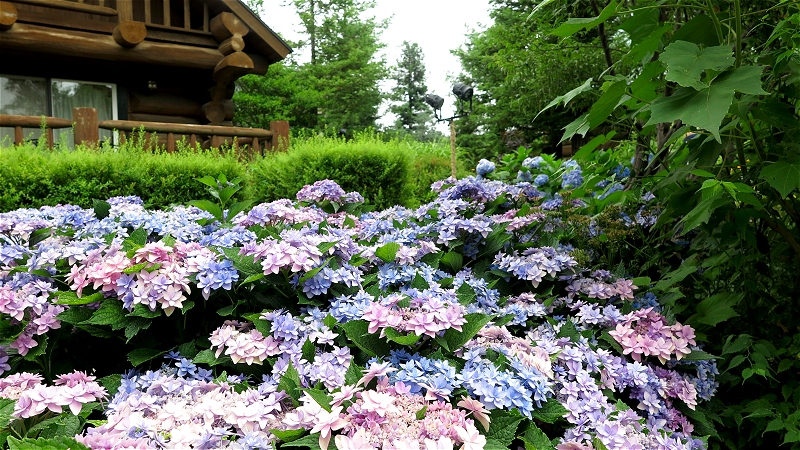 ホテルのロビーを通り抜けお庭に出ると・・・ そこには色々な山小屋風ロッジが・・・ そして周りにはアジサイが・・・
