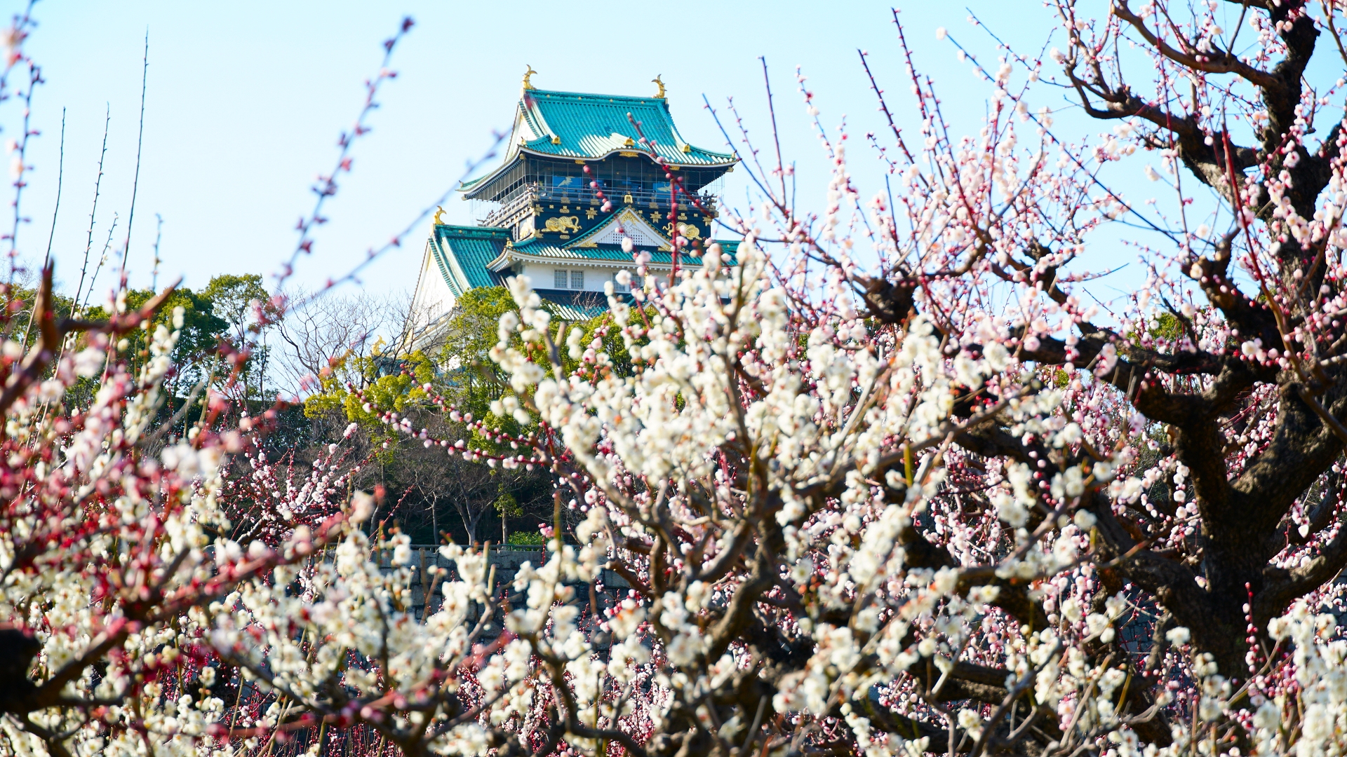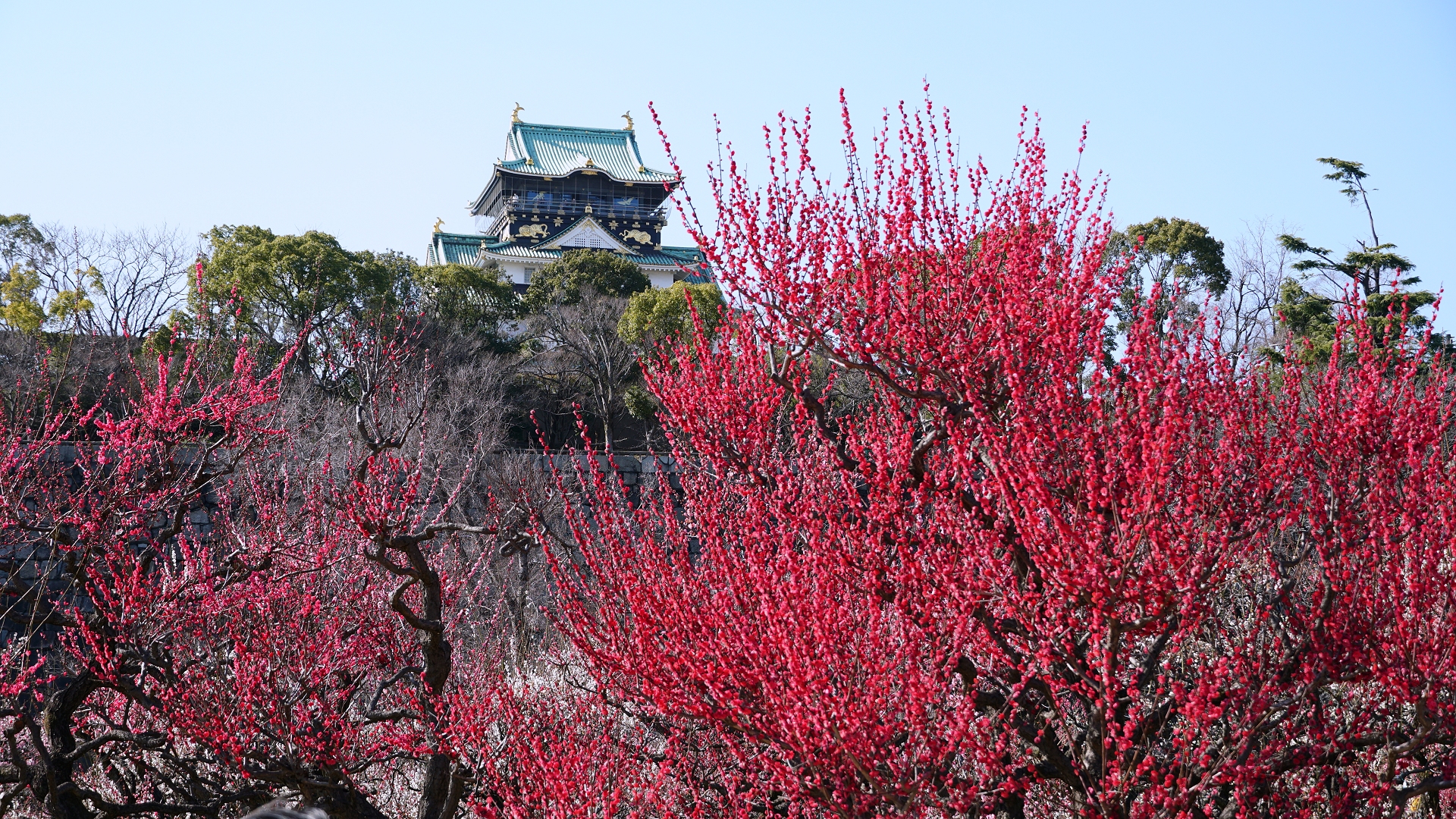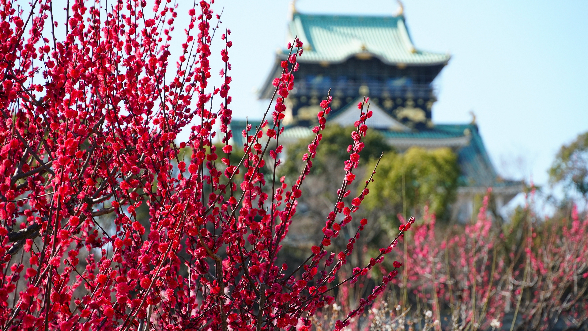 後ろに大阪城を置きながら紅梅を・・・