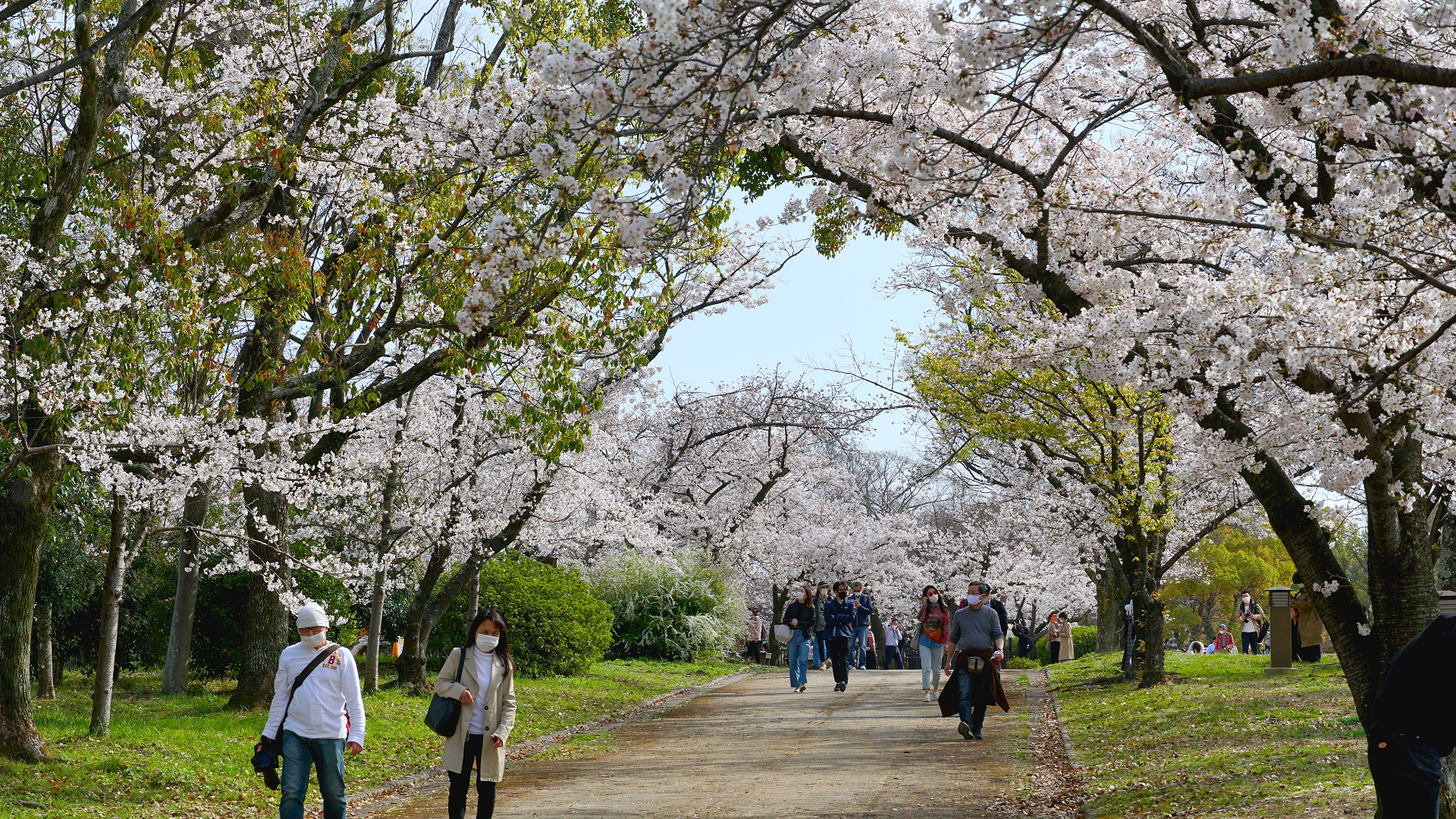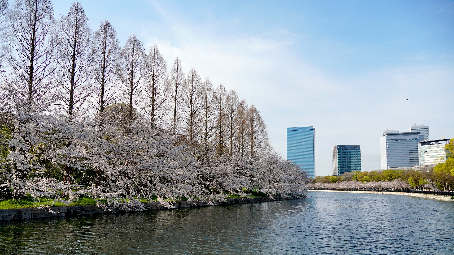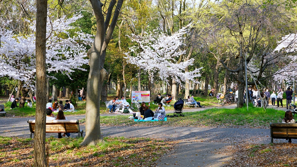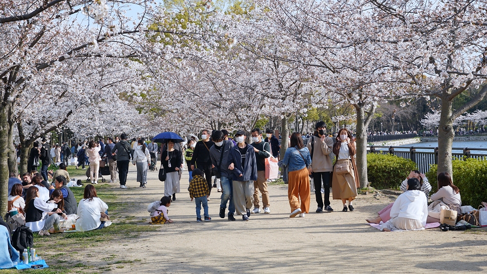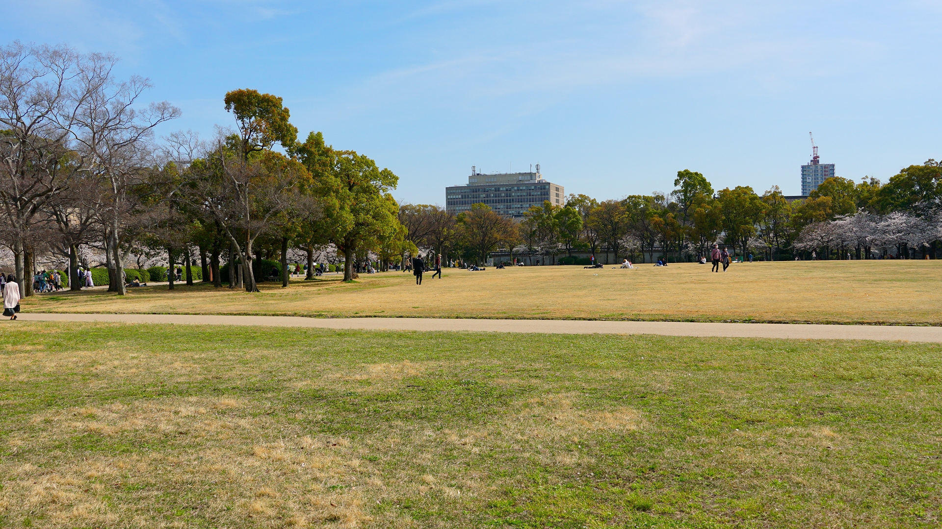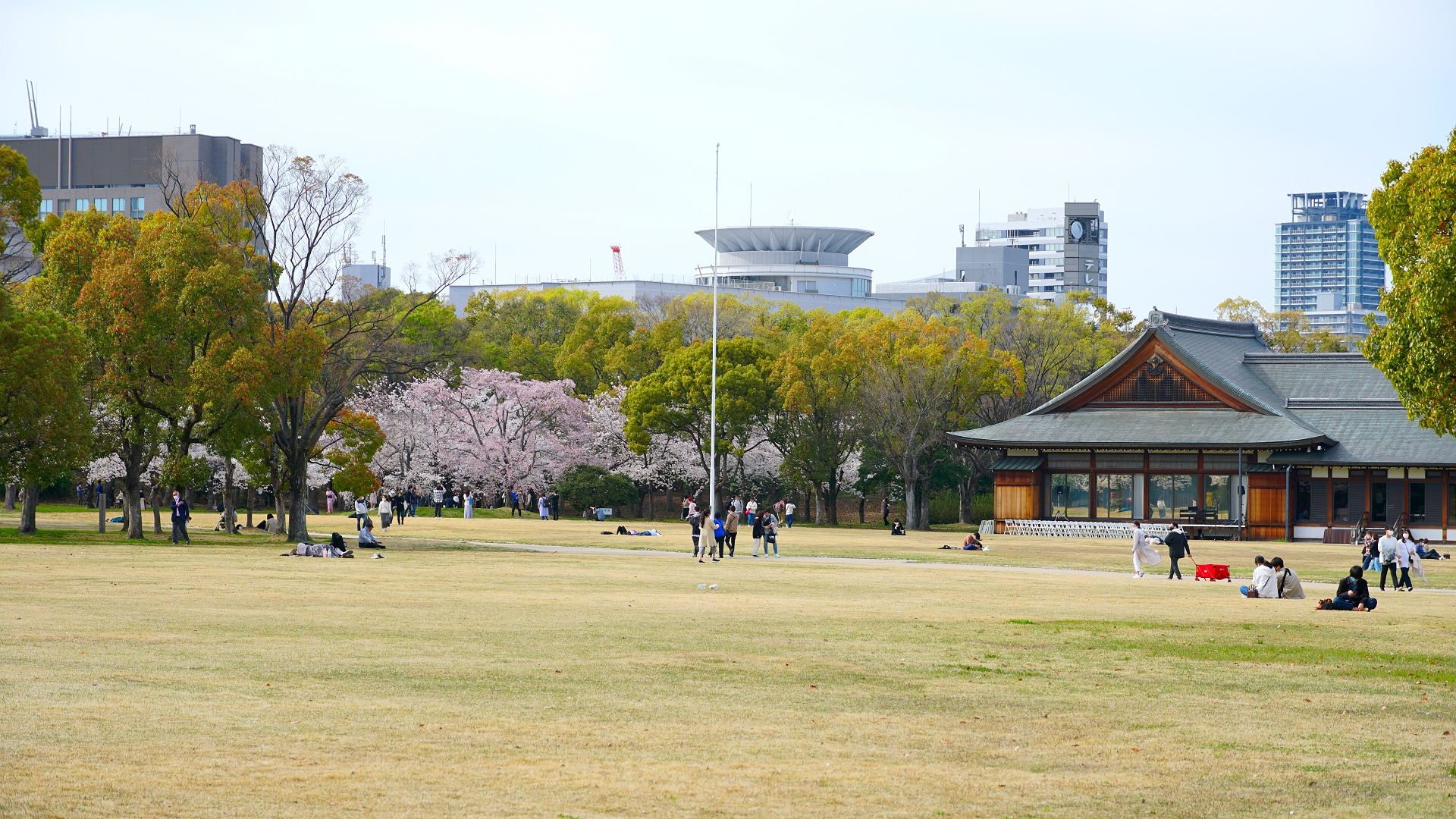 やはりいつもより相当人影は少ないです。 土曜日とはいえ、中でシートを敷いての飲酒飲食ができないとなると仕方のないことかも・・・ 右端の建物は迎賓館です。