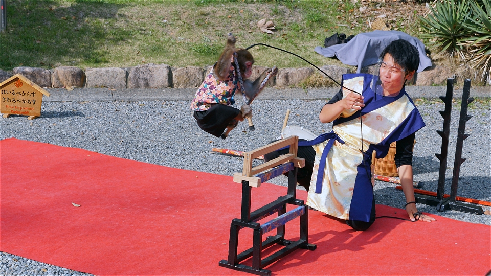 入り口では猿回しが・・・ ジャンプの真っ最中・・・ 自分より背の高い障害物をヒョイとひとっ飛び・・・